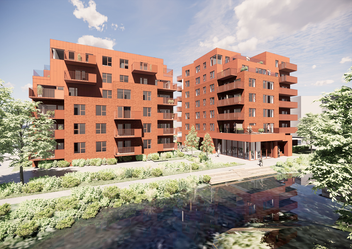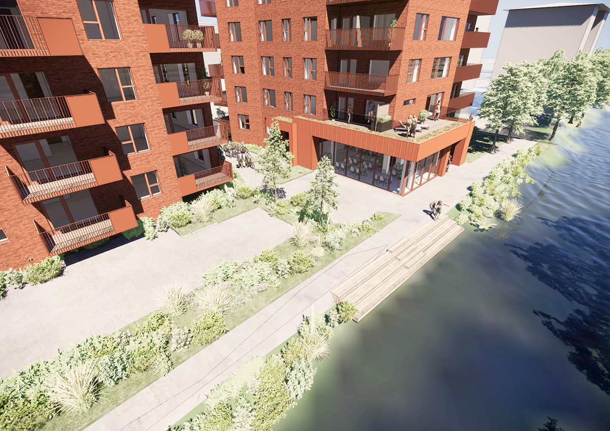 Visualisering af mulig udformning af byggeri og adgang til åen.