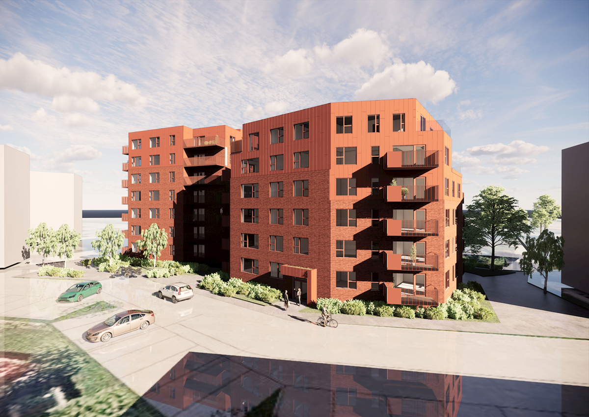 Visualisering af mulig udformning af byggeri set fra sydvest.