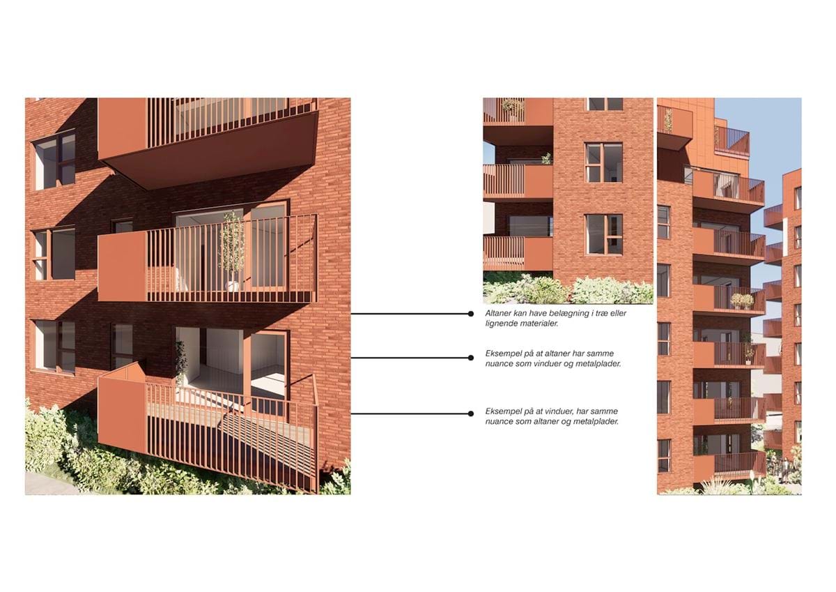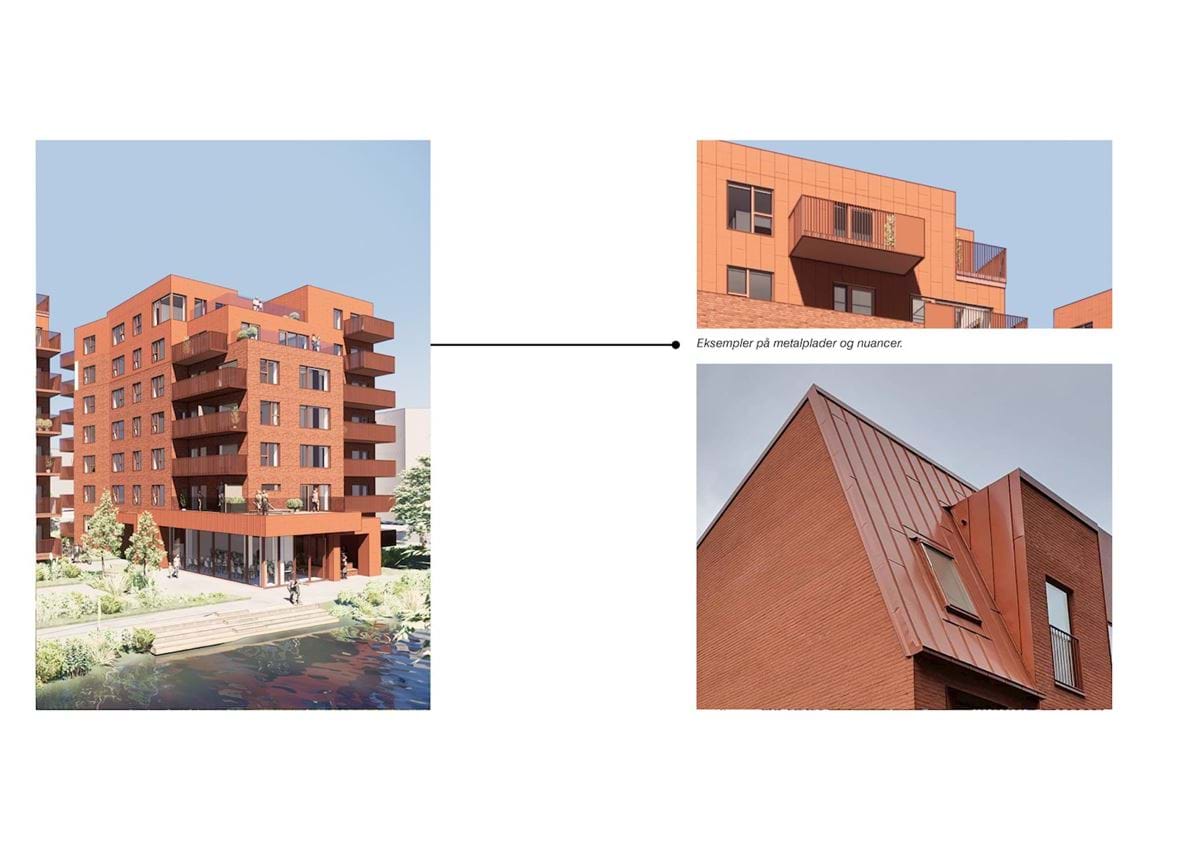 Materialer i rød tegl, med rød fuge og øverste etager i metalplader i en rød farve.