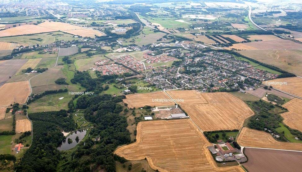 Luftfoto over Egebjerg med lokalplanområdet og Hansted Skov i forgrunden.