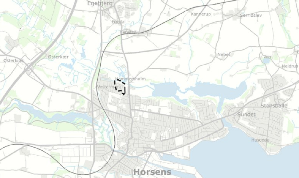 Lokalplanområdet, som har en størrelse på ca. 11 ha, ligger i Horsens bys nordlige del. Området ligger meget lavt og skråner ned mod Store Hanstedå.