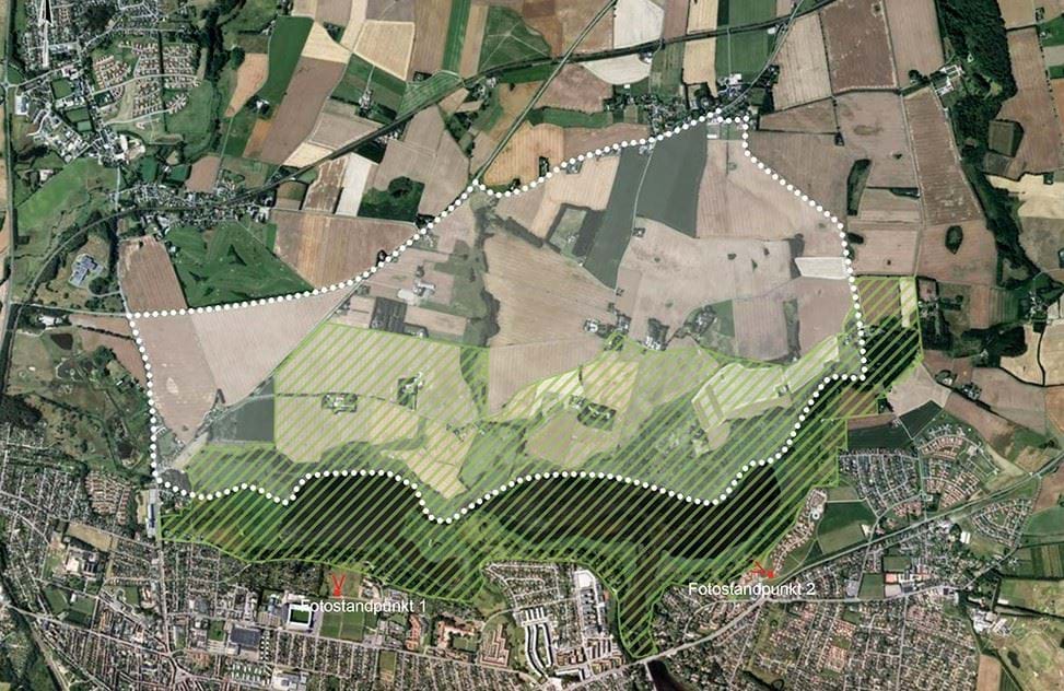 Fotostandpunkt 1 - Udsigt til Nørrestrand fra Backstagevejen bag Forum Horsens med bebyggelse i gule farver - POLYGON.