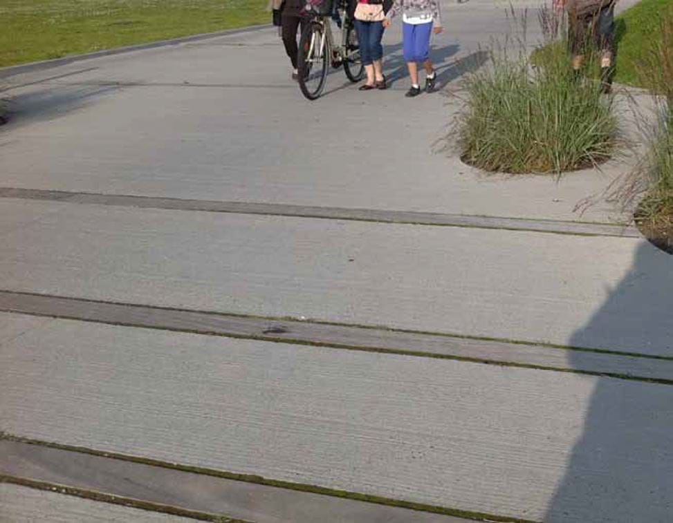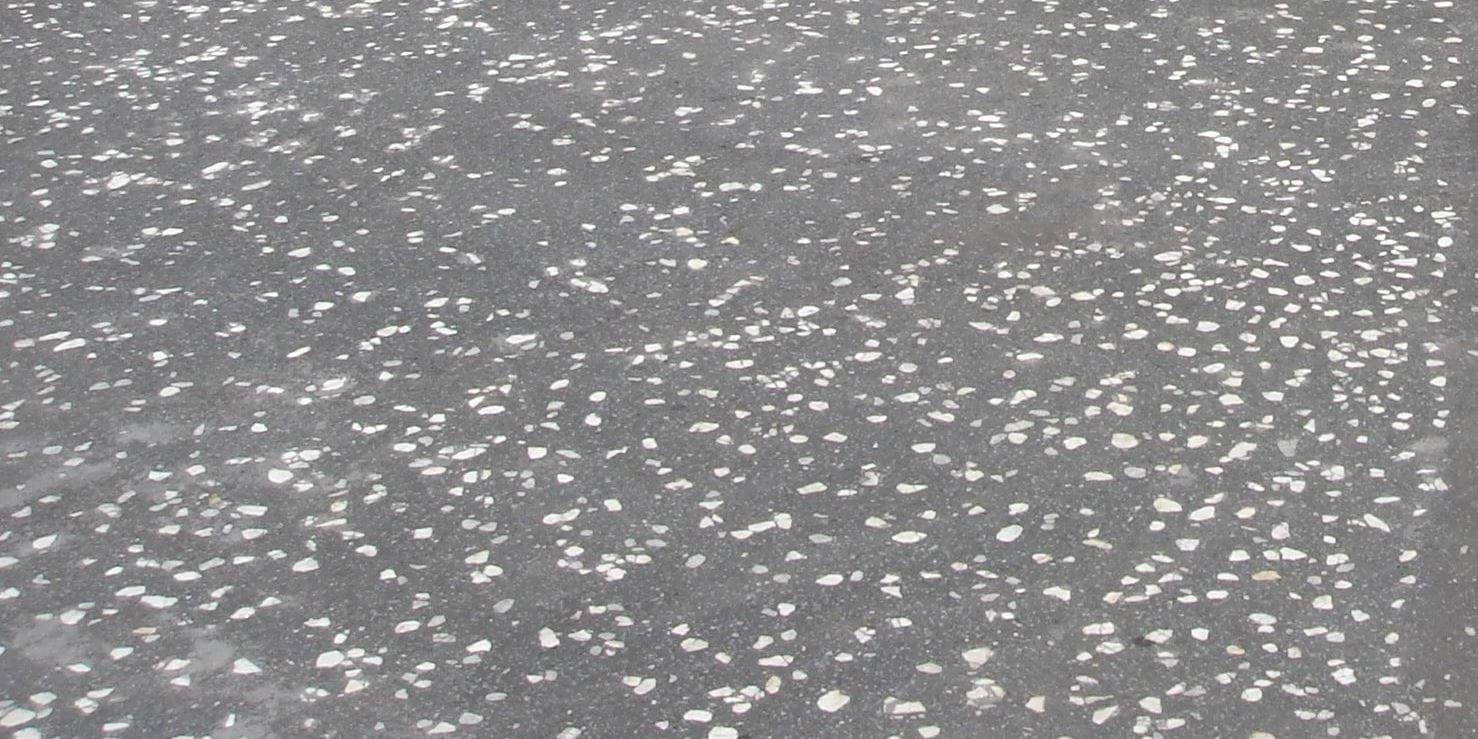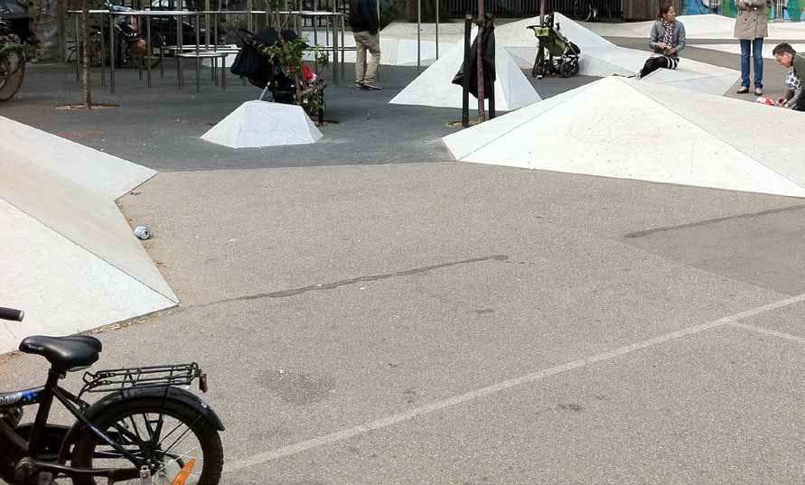 Her er vist asfalt med "isbjerge". For at fremme leg og bevægelse kan en del af den faste belægning også erstattes af gummi ved legepladser