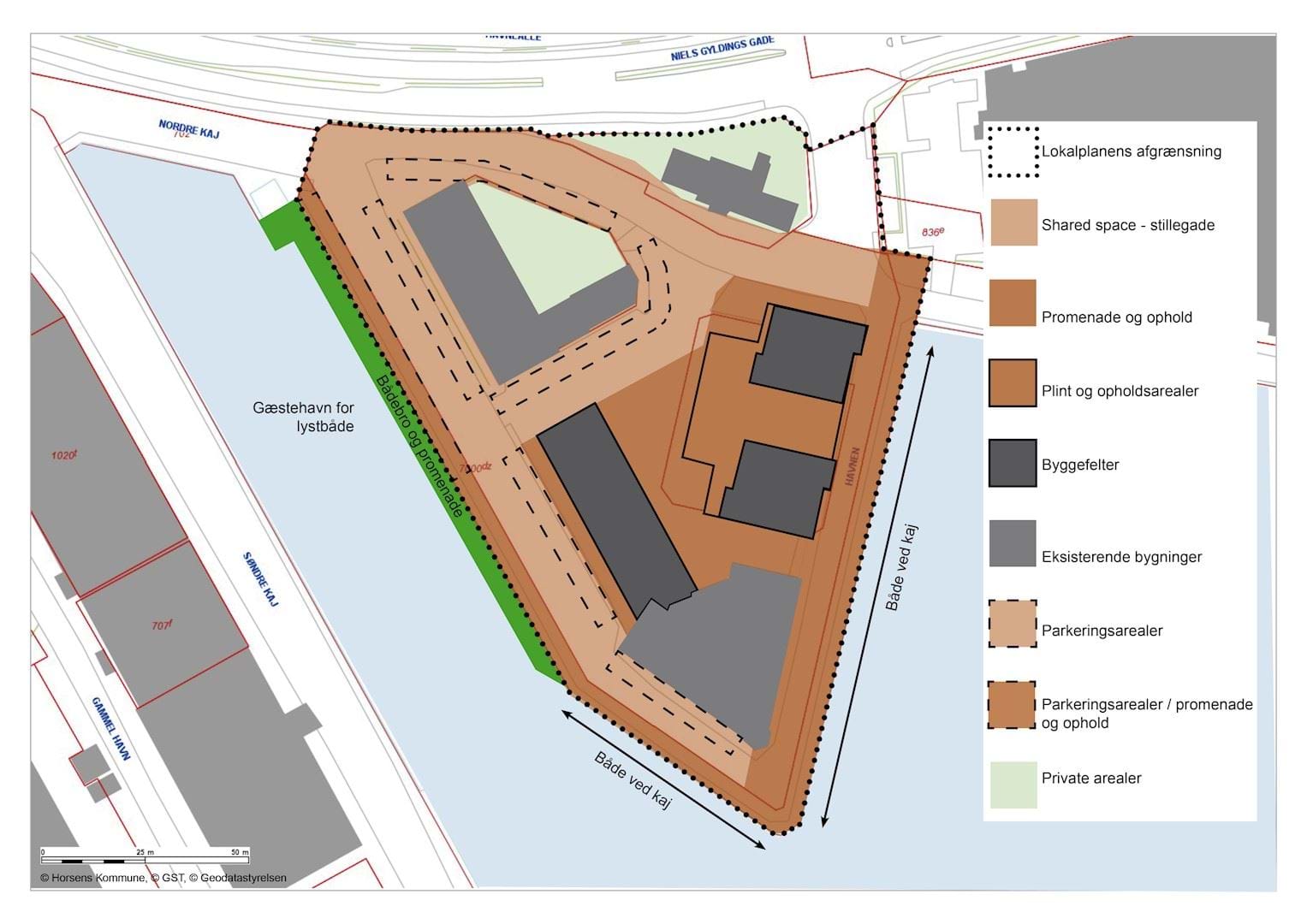 På vedstående plan ses hvor det vil være tilladt at parkere. Området er et meget specielt sted i Horsens, fordi det ligger som kobling mellem by og havn, og fordi en stor del af området ligger ud til vandet med gode muligheder for ophold. Det har derfor været et mål, at parkeringspladserne placeres i havnetrekantens indre med så få pladser mod promenaden som muligt.