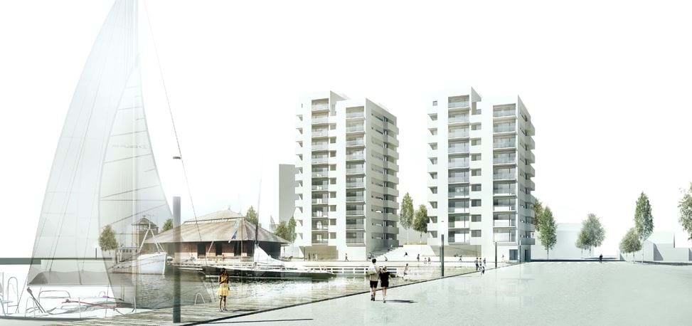 Boligtårnene er placeret på en hævet plint, der skjuler bygningernes parkeringspladser og hvis tag danner ankomst til bygningerne og indrettes som friareal for boligerne. Boligerne er ved deres hævede placering på plinten sikrede mod højvande. Mod øst udformes plinten med en opholdstrappe, der fører ned til promenaden. I en del af plinten ud mod promenaden kan der indrettes en iskiosk eller lignende. Boligtårnene har en lodret opdeling, for visuelt at få dem til at syne høje og slanke som siloer. De er hvide og fremtræder i betonelementer eller med en pudset overflade.