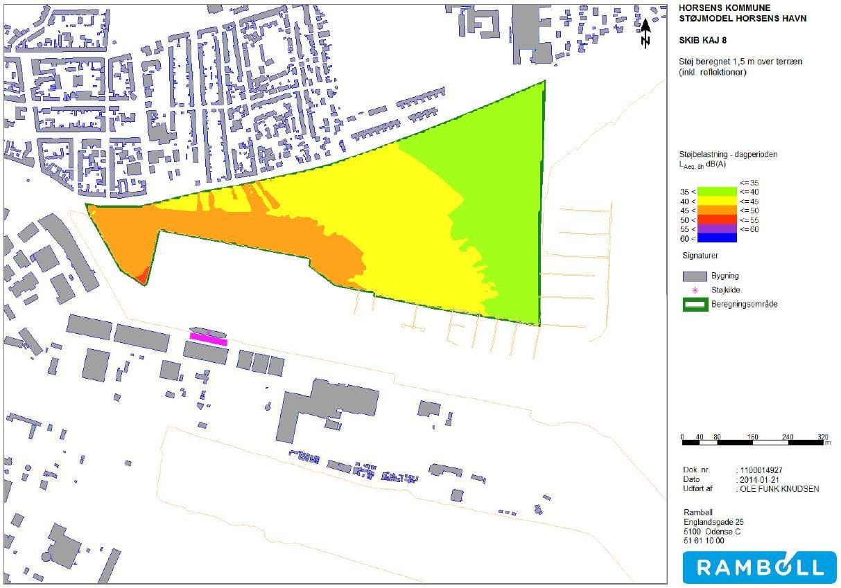 Støj fra Kaj 8. Den natlige grænseværdi på 40 dB er grænsen mellem gul og grøn farve. Grænseværdi for dag på 55 dB er overholdt.