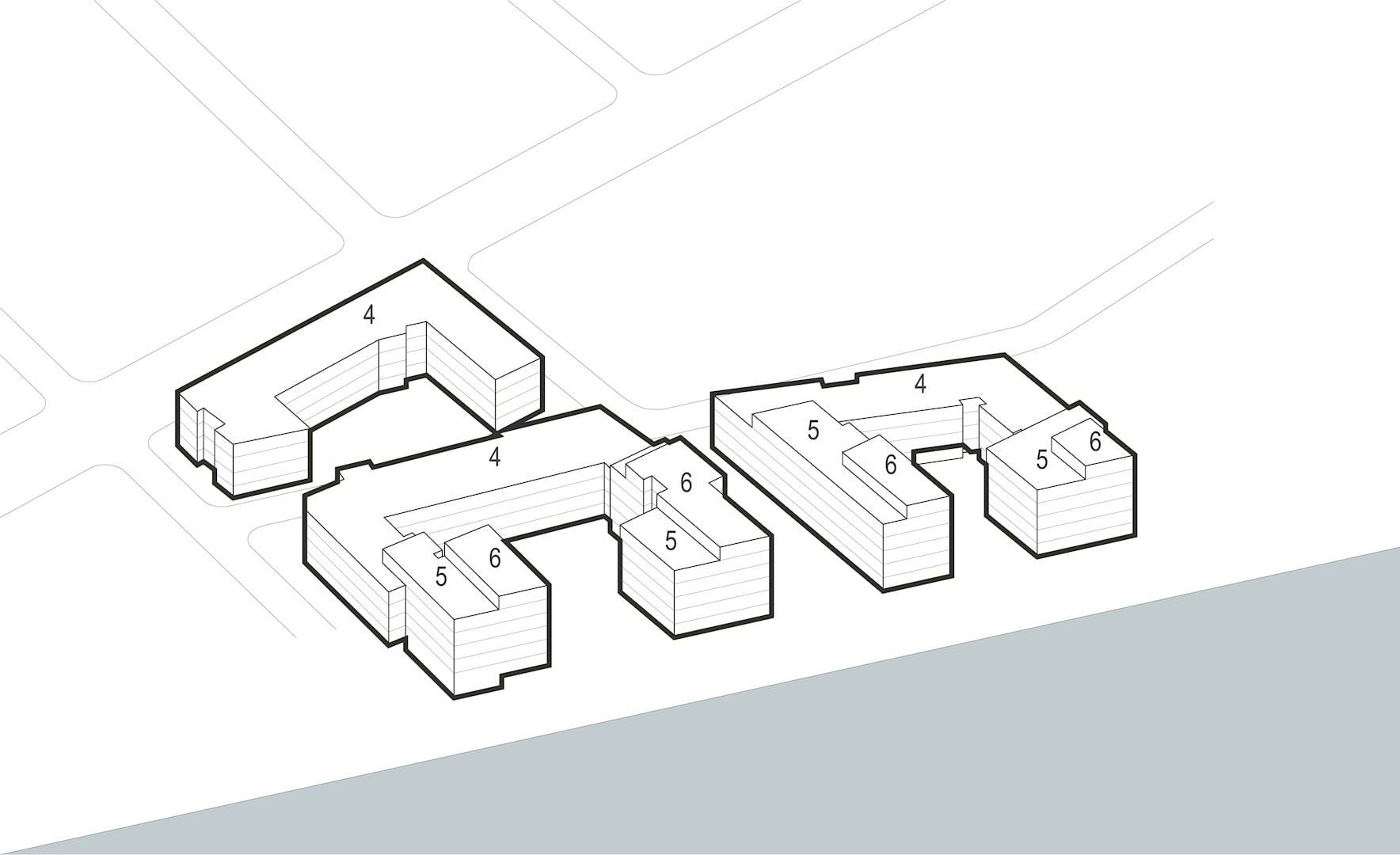 Byggeriet skaleres op fra 4 til 5 og fra 5 til 6 etager efter princippet på diagrammet.
