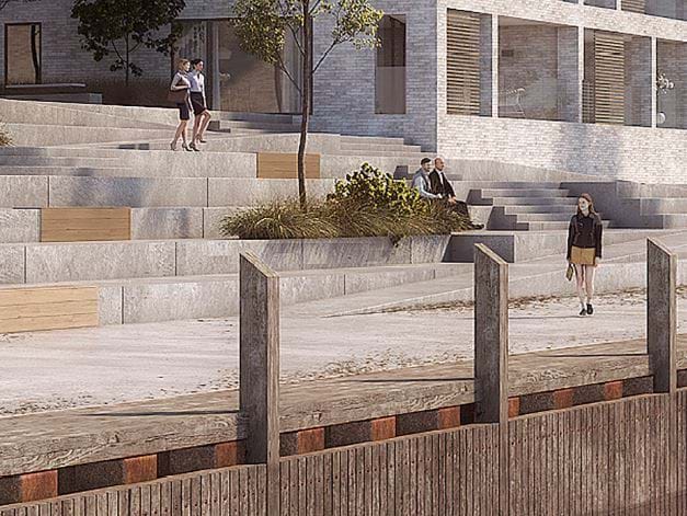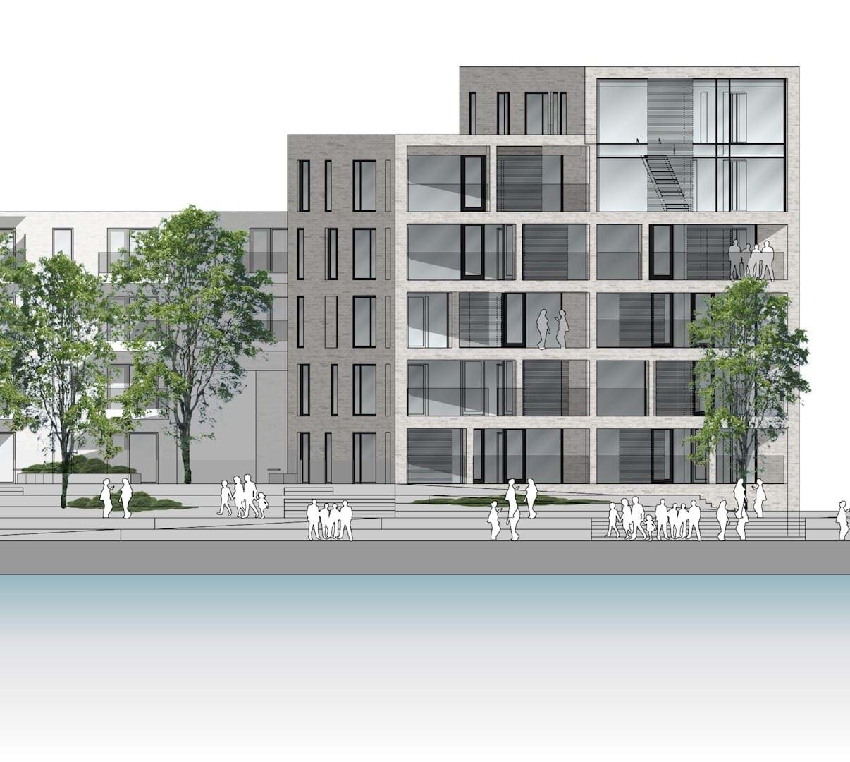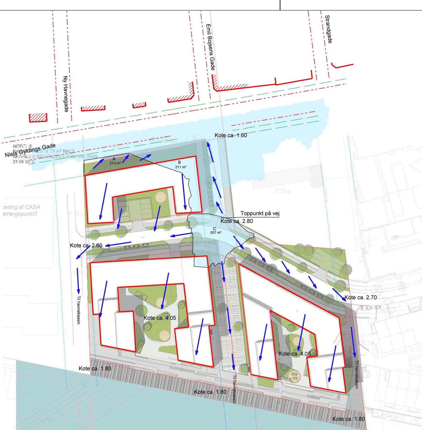 Volumenstudie af kommende byggeri fra Ny Havnegade. Lokalplanen regulerer byggeri til venstre.