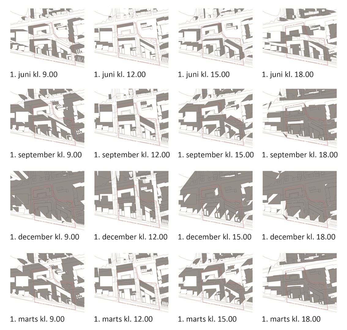 Skyggediagrammer, juni, september, december, marts.