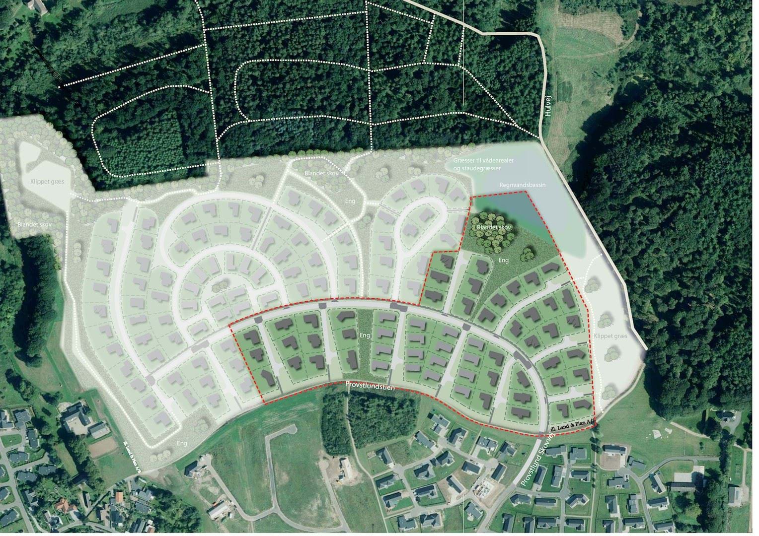Dispositionsplan for område nord for Provstlundstien. Den røde, stiplede linje markerer området indeholdt i nærværende lokalplan.