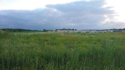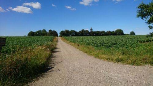 Området set fra Lovbyvej, hvorfra markvejen i en årrække har givet adgang til rideskolen på Nørremarksgården. Bebyggelsen placeres ca 100 m fra Lovbyvej. Den eksisterende beplantningen vil kun i mindre grad kunne bevares.