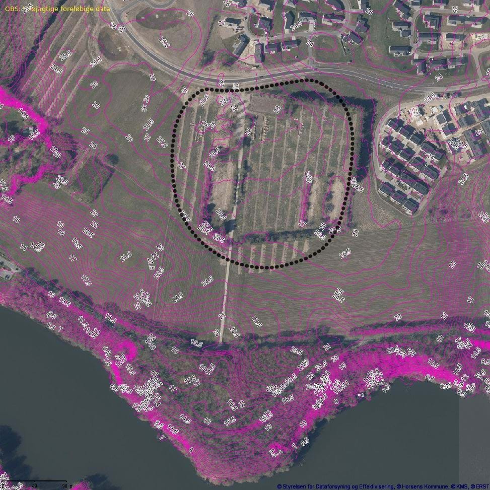 Ortofoto fra 2019 med Rantzausbakkes afgrænsning og nærmeste omgivelser.