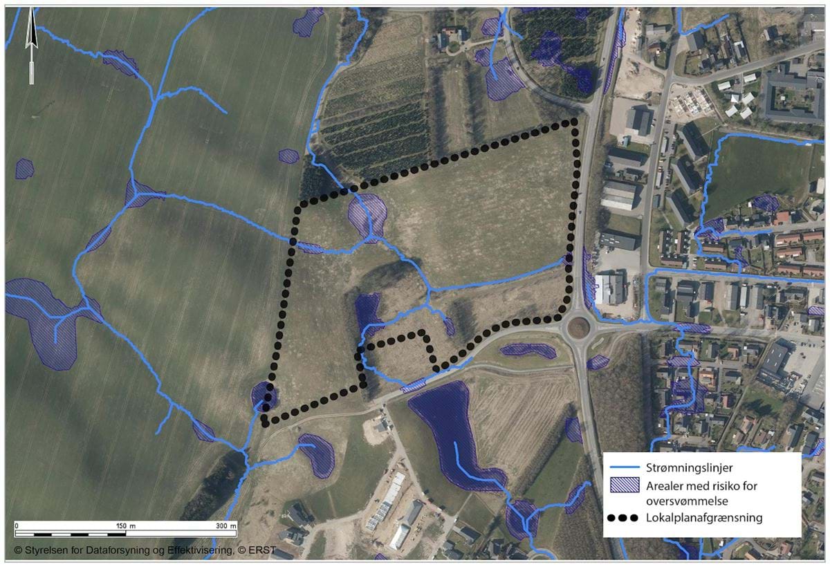 Lokalplanen skal derfor gennem sine bestemmelser sikre, at der tages hensyn til disse områder. Der kan derfor ikke etableres bebyggelse, som afskærmer strømningslinjerne, dog kan tekniske anlæg som veje indrettes til at lede ekstremregn jf. § 8.6.