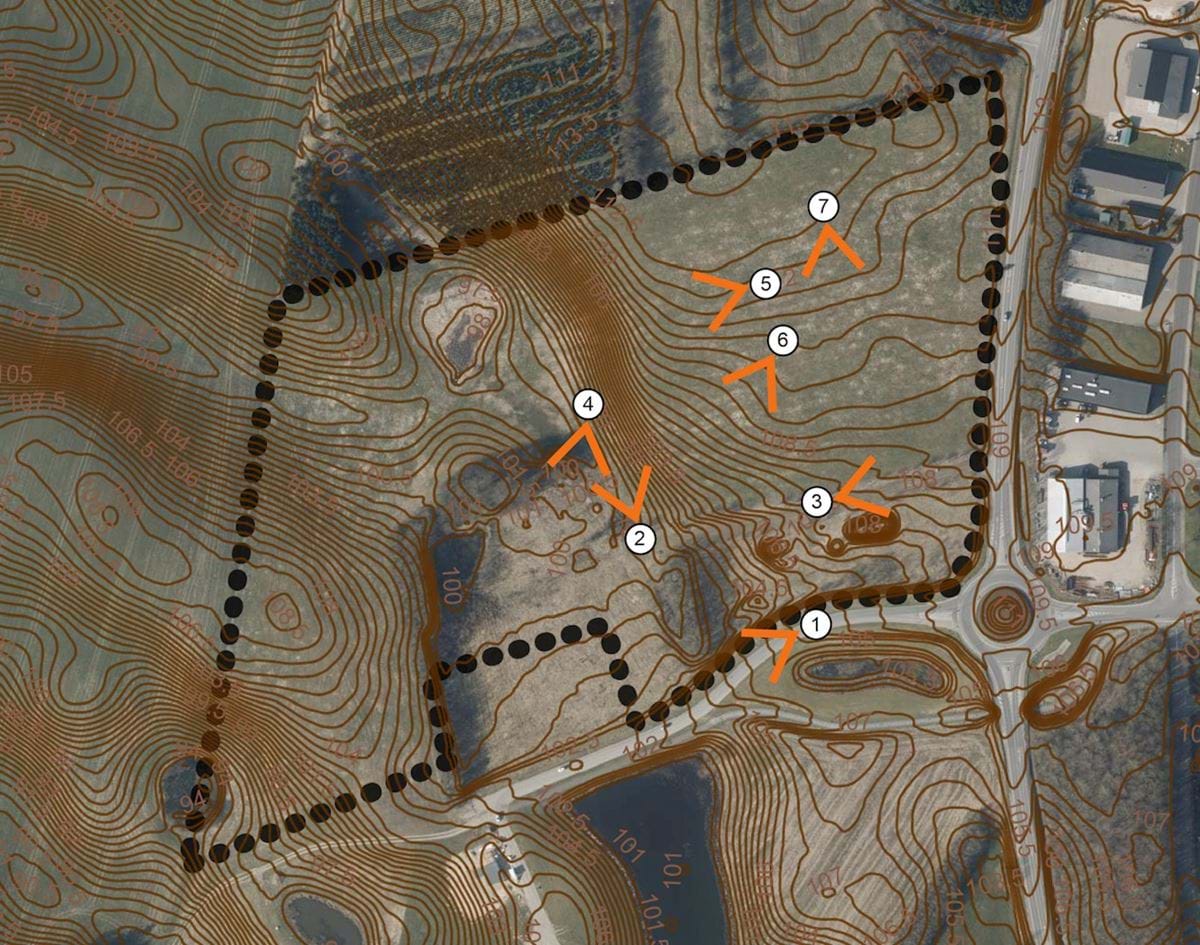 Nedenfor ses et kort over lokalplanområdet, hvorpå der er markeret 7 fotografiske registreringspunkter. Registreringen er foretaget d. 3. marts 2021.
