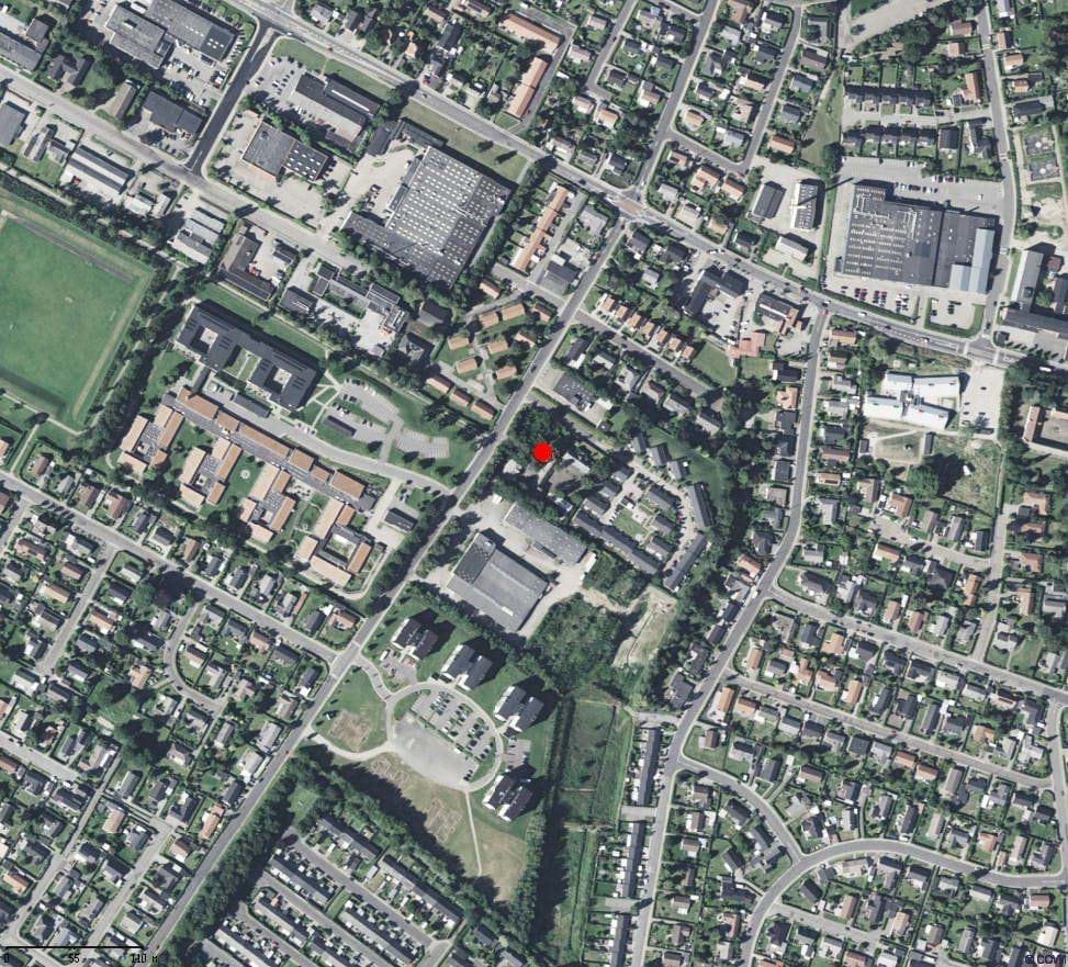 Luftfoto fra 2015 - den røde markering viser lokalplanområdet