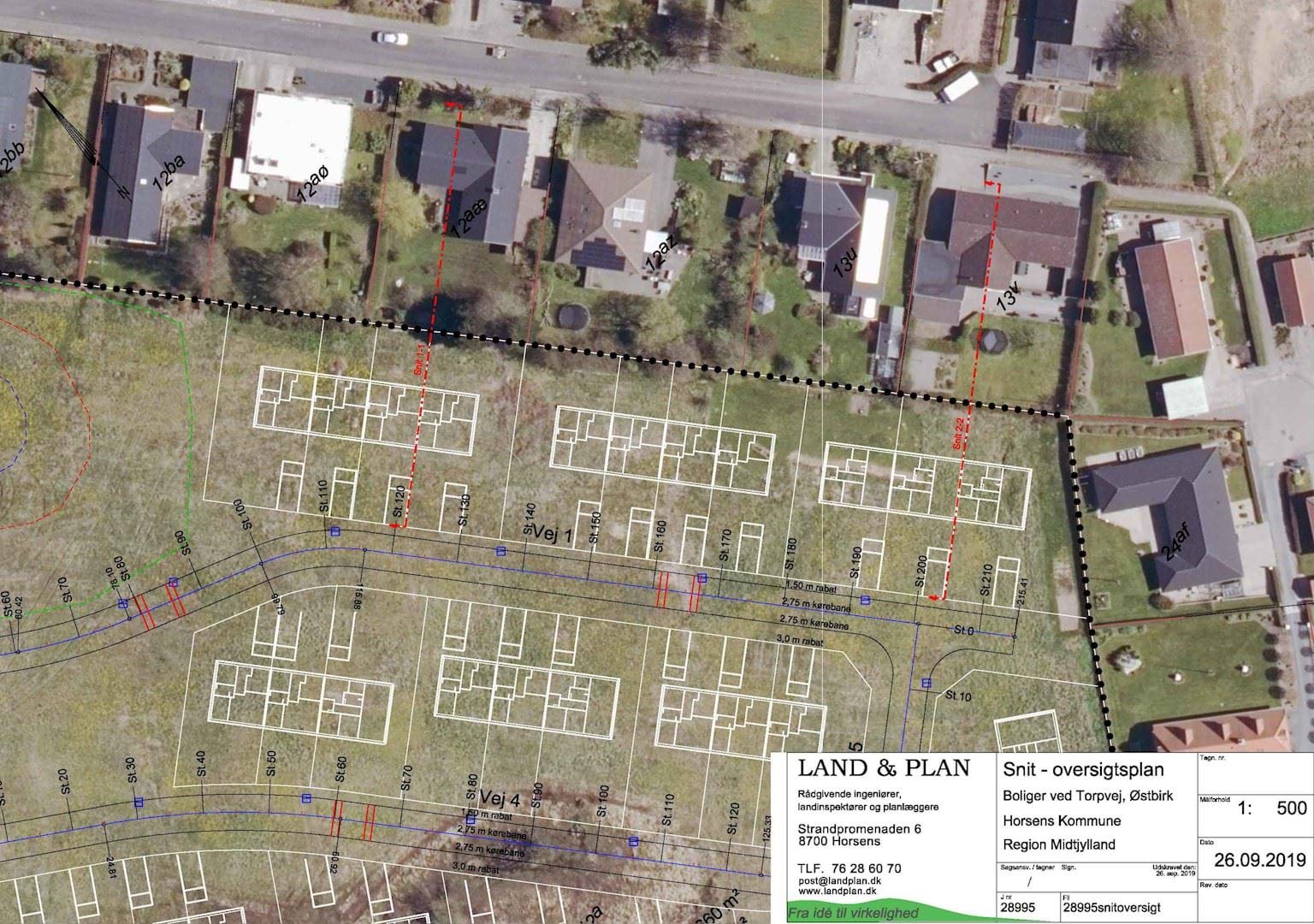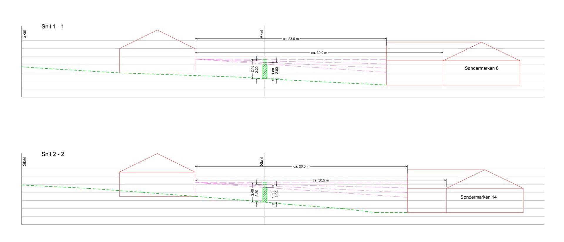 Bebyggelsen er projekteret med en afstand på 8 m til det nordlige skel på ovenstående tegninger, men der gives i lokalplanen mulighed for at placere bebyggelse op til 6 m fra det nordlige skel.