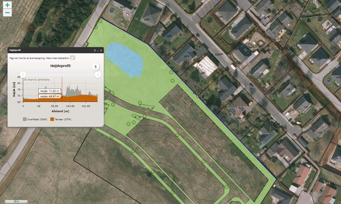 Højdeprofil langs det nordlige skel viser at den eksisterende beplantning er høj og tæt de fleste steder i dag.