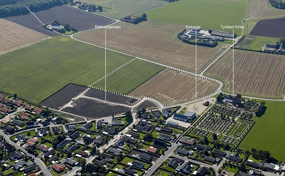 Lokalplanområdet set mod sydøst. Nord for området ses den første udstykning på Tyrsted Høj, Bakkestjernen