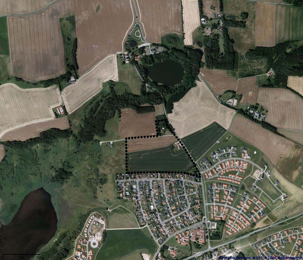 Luftfoto over lokalplanområdet med Nørrestrand mod vest, Vær Kirke og Vær sø mod nord samt Stensballe mod syd og øst.