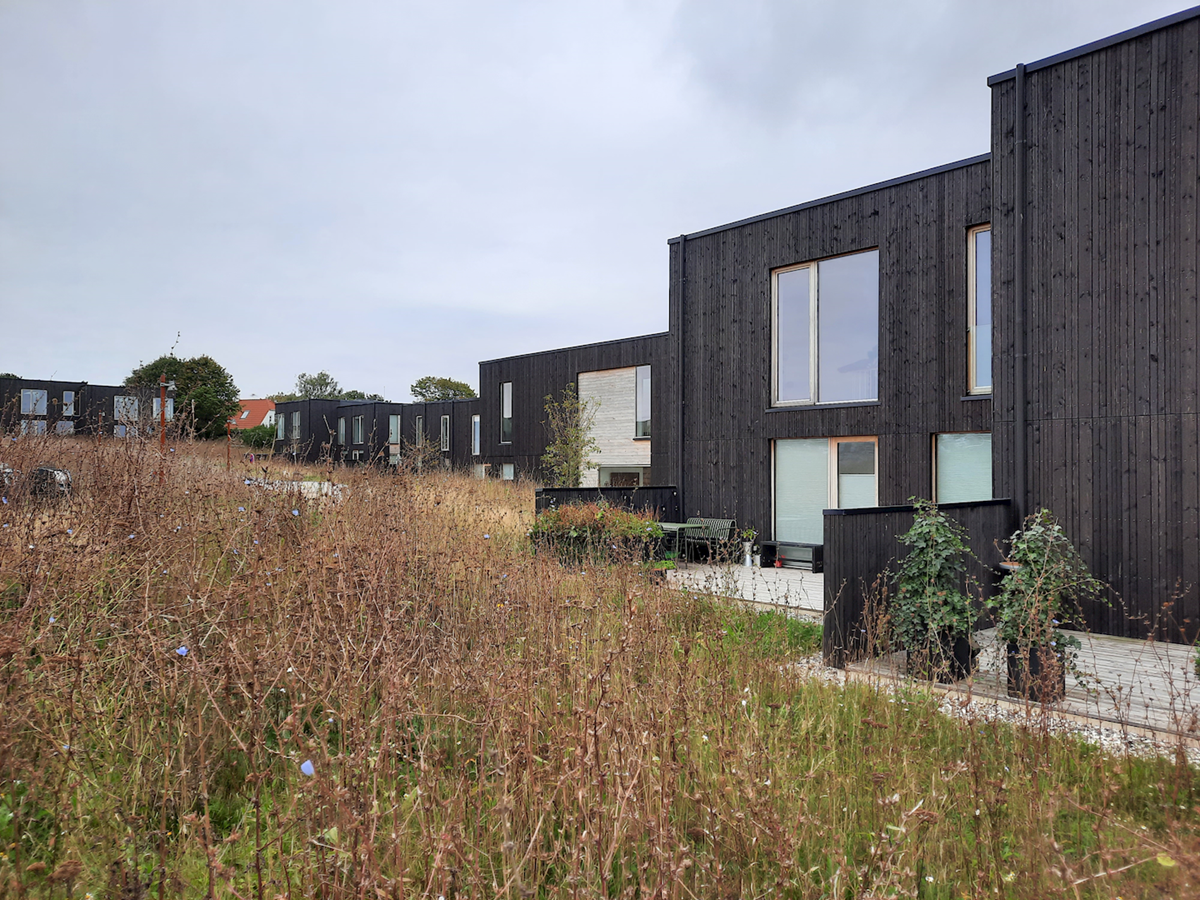 Boligerne tilpasses lokalplanområdets terræn, da det både kan være med til at hjælpe med vandhåndteringen inden for lokalplanområdet og bringer naturen helt tæt på bebyggelsen. Derudover kan der også i materialevalget arbejdes med at skabe harmoni mellem ny og eksisterende bebyggelse samt at føre naturen yderligere ind i området, f.eks. kan der arbejdes med træ, der patinere med vind og vejr, eller grønne tage.