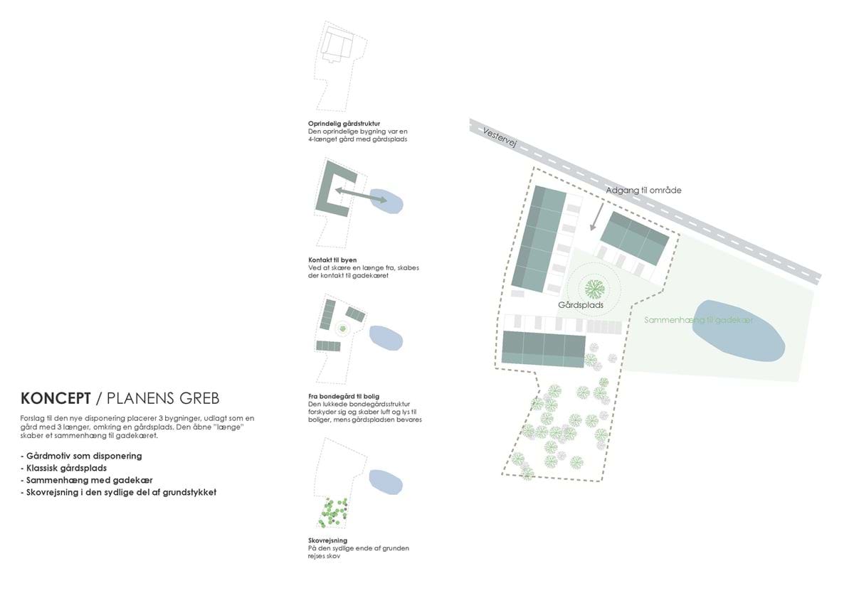 Projektet tager udgangspunkt i gårdmotivet i disponeringen af bebyggelsen. Rækkehusene er placeret som 3 bygninger, udlagt som en gård med 3 længer, omkring en gårdsplads. Hvor der tidligere har været en fjerde længe, skabes der en sammenhæng til gadekæret.