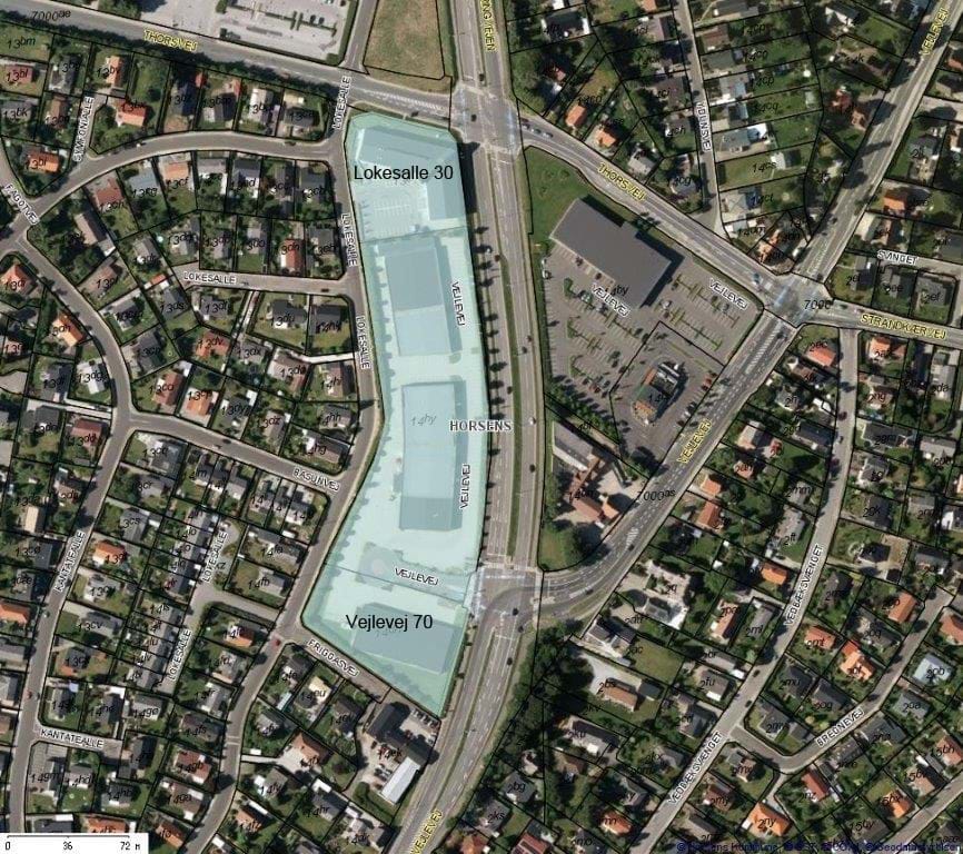 Lokalplanområdet med angivelse af de to bygninger, der ønskes ombygget til dagligvarehandel, Vejlevej 70 og Lokesalle 30