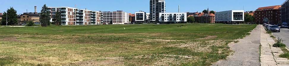Campusgrunden i forgrunden med eksisterende bebyggelse i baggrunden ved Emil Møllers Gade og Godsbane Gade