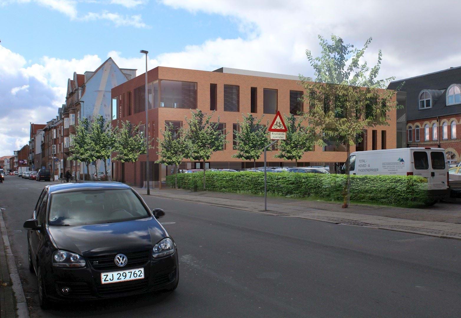 Lokalplanen giver mulighed for at bygge en op til tre-etages bygning vinkelret på Sønderbrogade, som vist på visualiseringen og illustrationsplanen. Bygningen bygges i røde teglsten, så den kommer til at harmonere med den eksisterende bygning, og med de fleste bygninger i Sønderbrogade. Placering og udformning vil danne en pendant til Sønderbrogade 14, og bygningen vil sammen med træbeplantningen langs skellet visuelt lukke et hul i husrækken, og dermed stramme gadebilledet op.