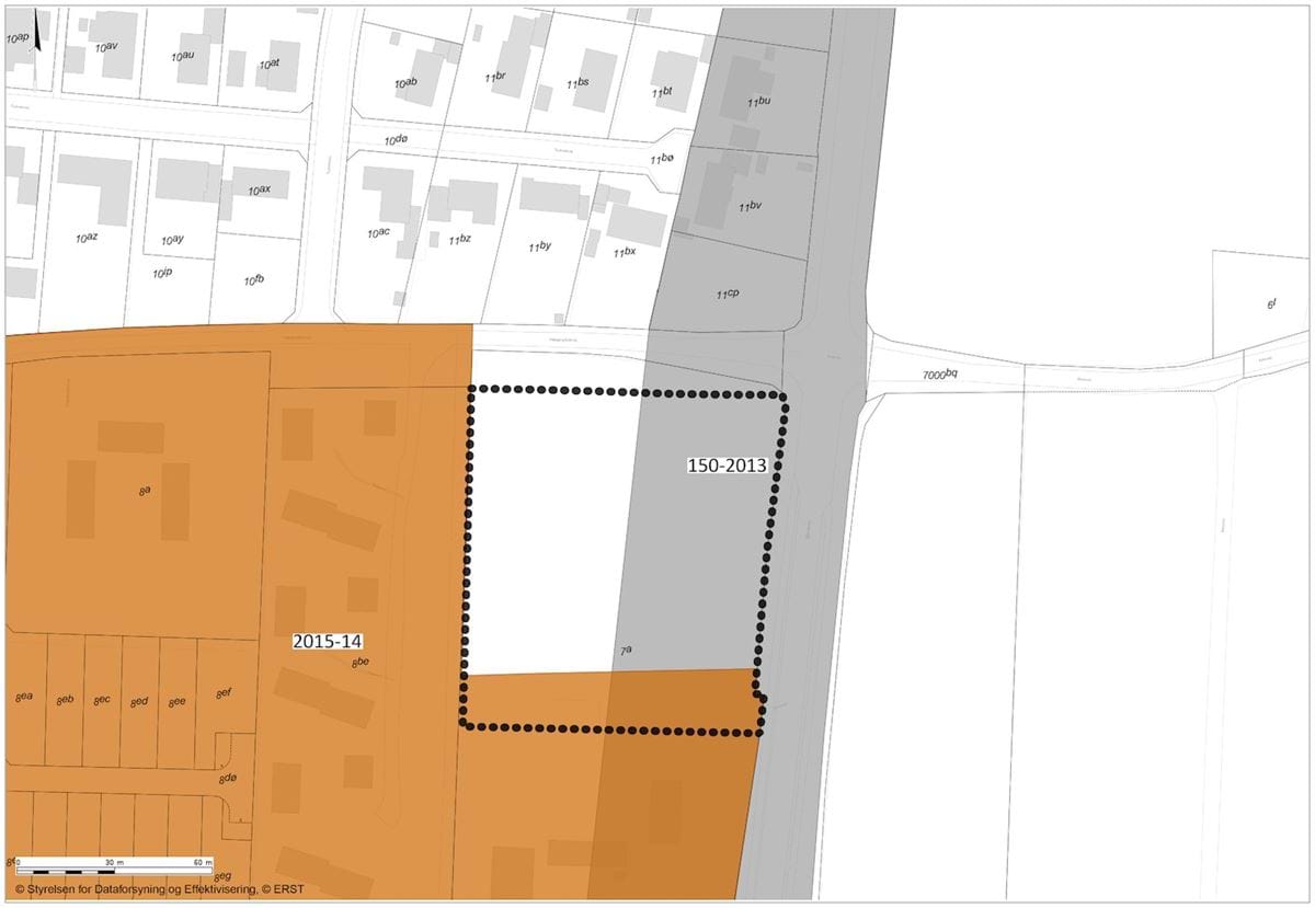 Overlap ml. lokalplanafgrænsning og eksisterende lokalplanområde - det lille område nord for lokalplanafgrænsningen aflyses ved endelig vedtagelse.