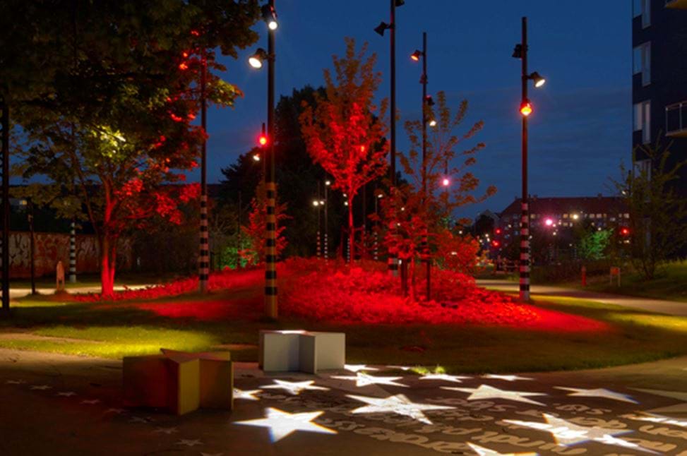 Reference på et urbant byrum grafiske mønstre og belysning (SLA Arkitekter)