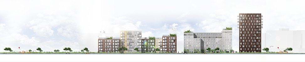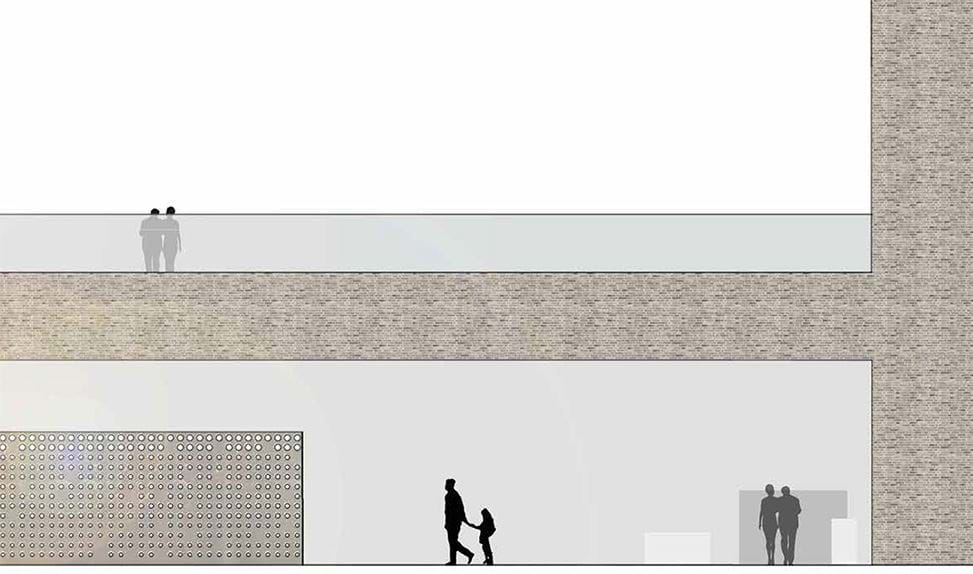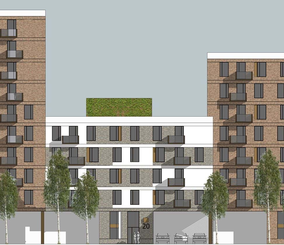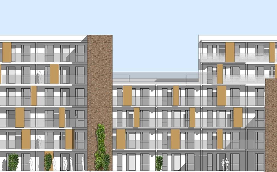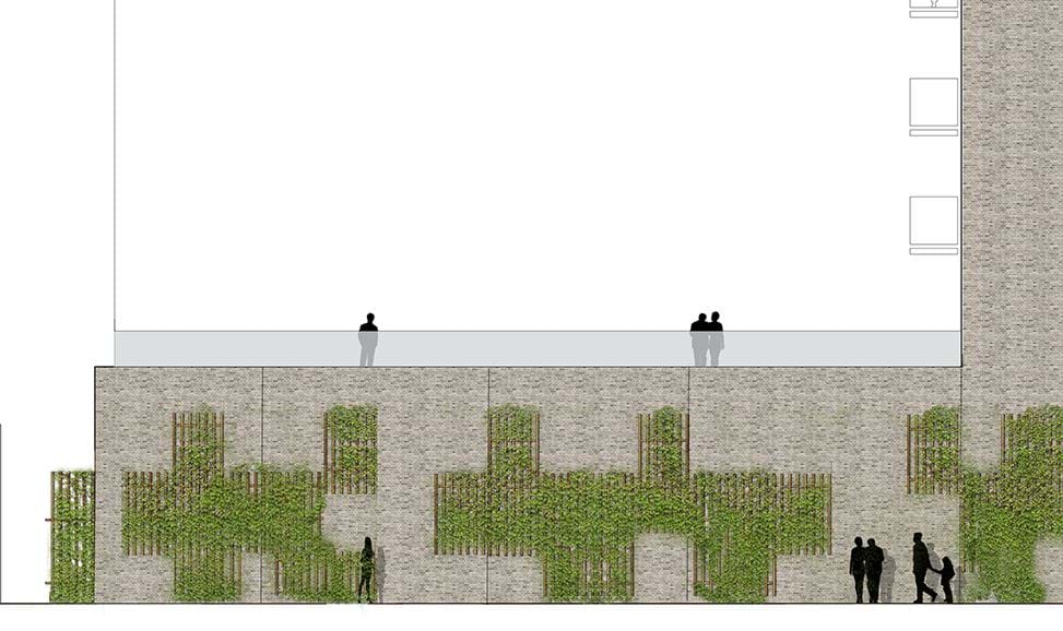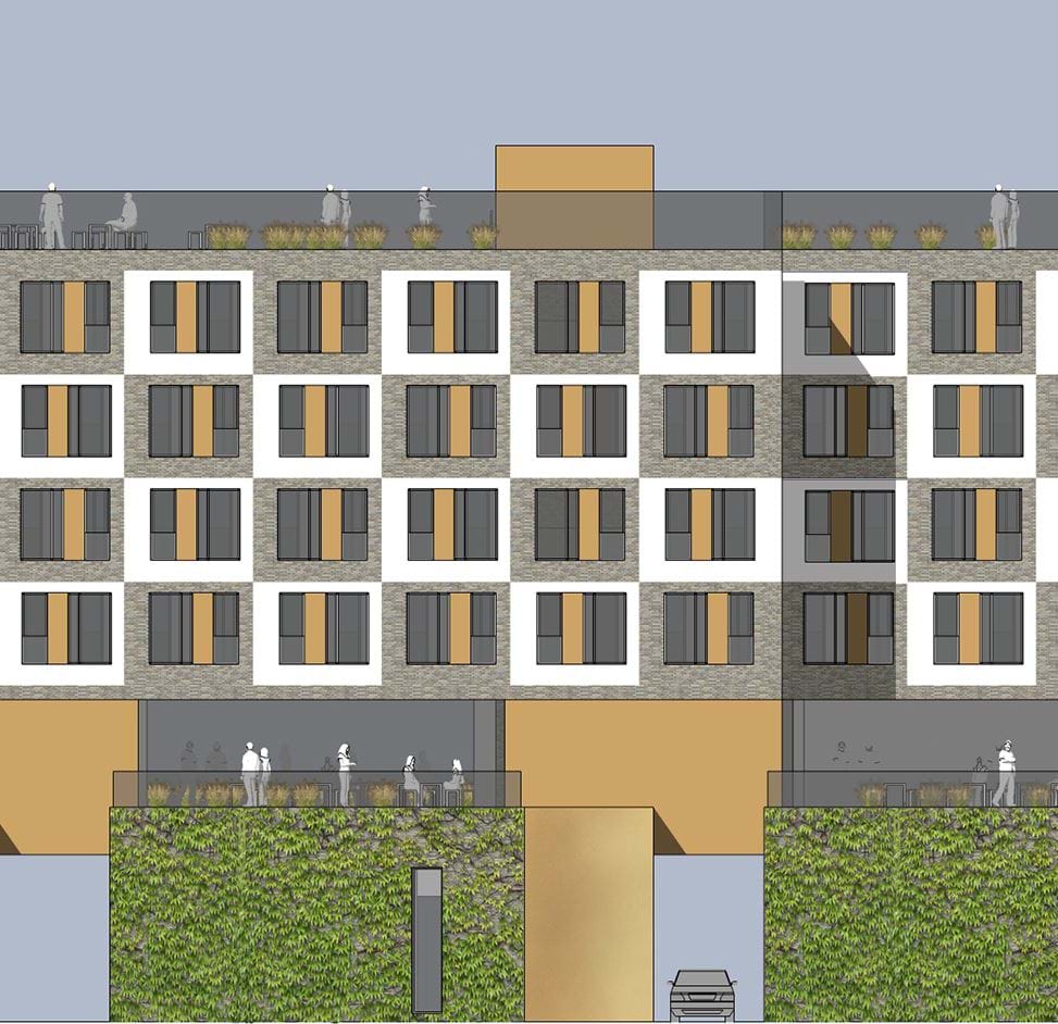 Principudsnit af facade mod taghave i delområde 1. Facaderne kan suppleres af træpartier eller lignende materiale for at skabe et imødekommende opholdsmiljø med varierende teksturer.