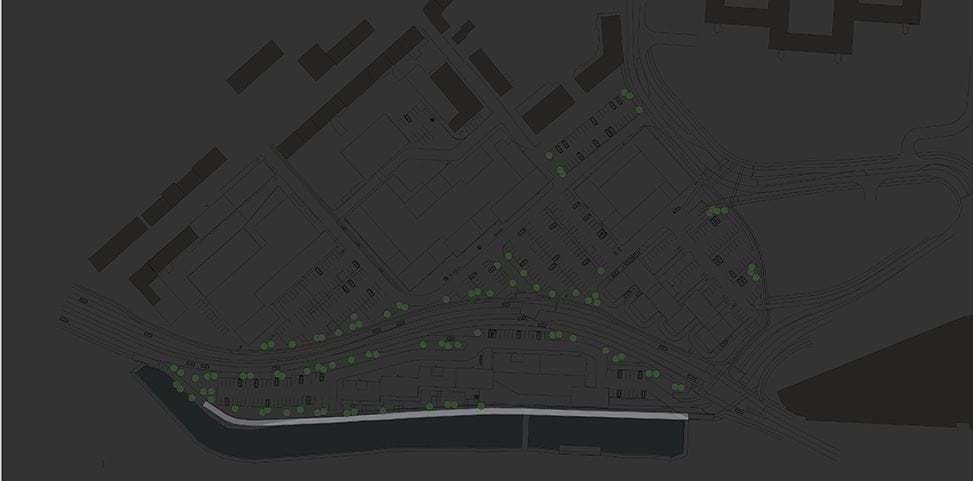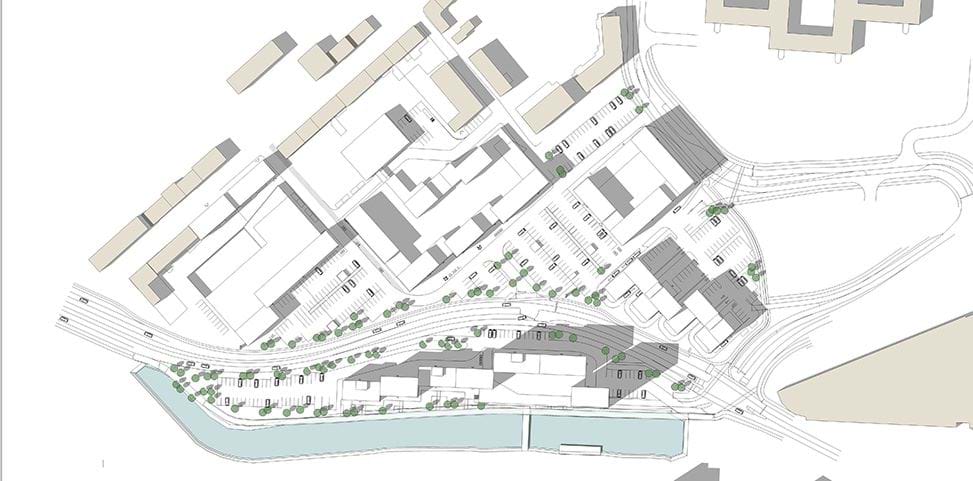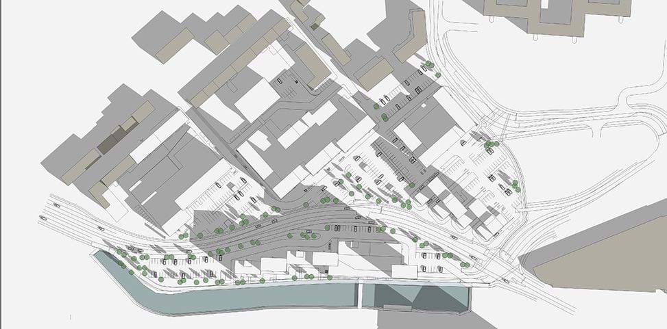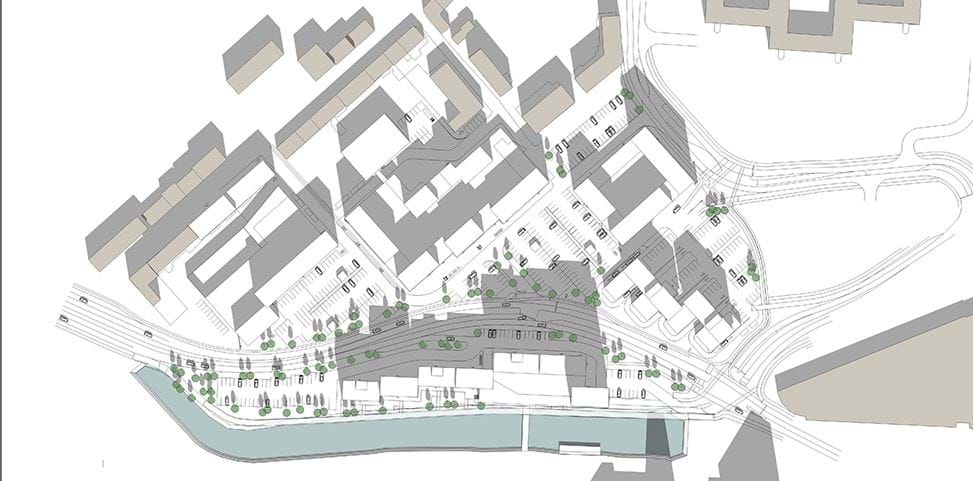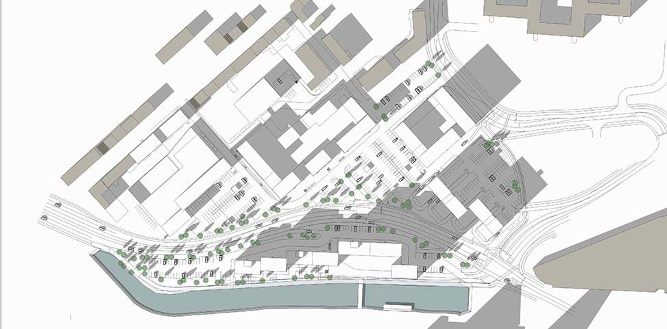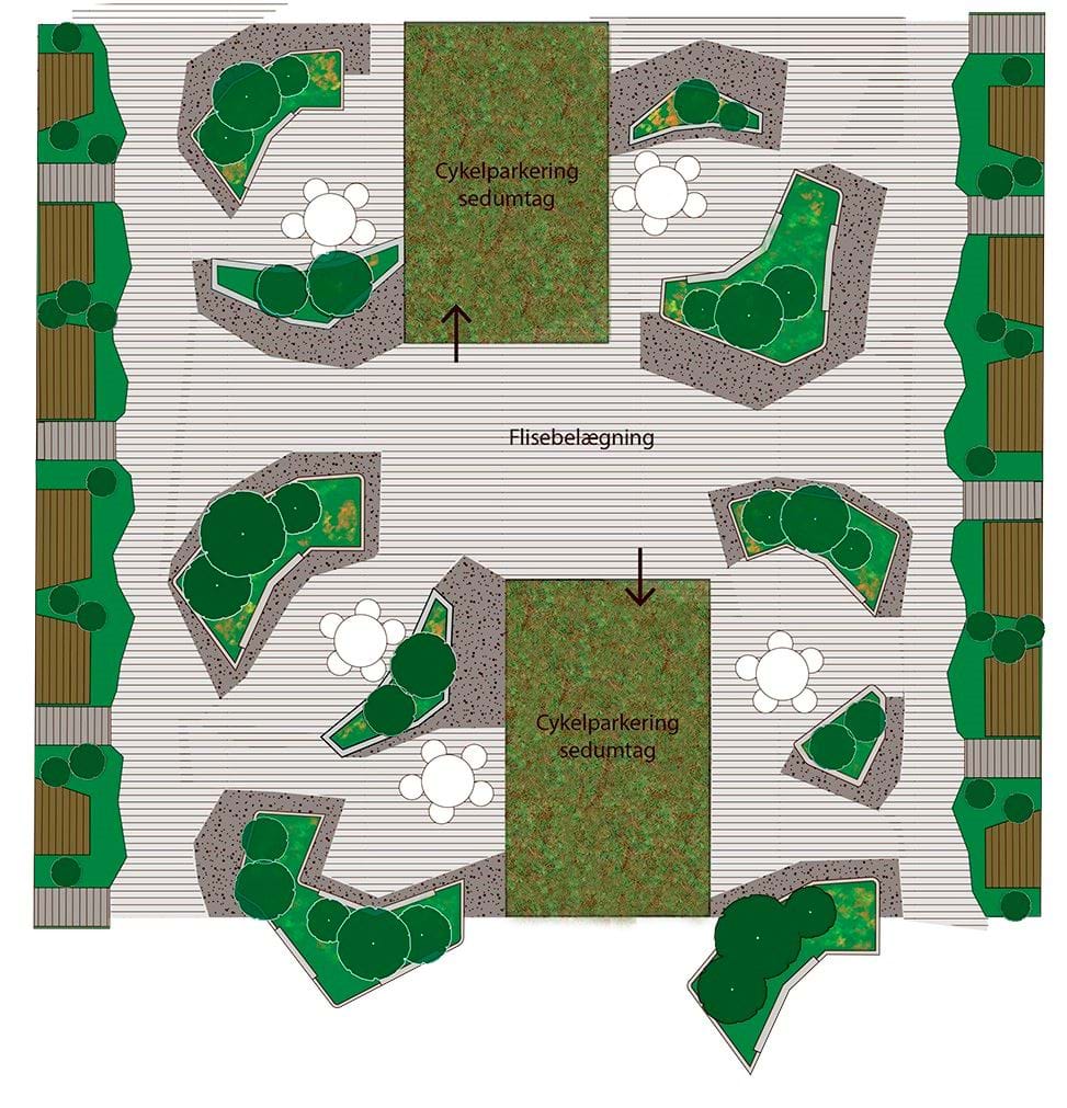 Principudsnit "Parkering i byrum". Byrummet bearbejdes med belægningsskift, mønstre, belysning og beplantning.