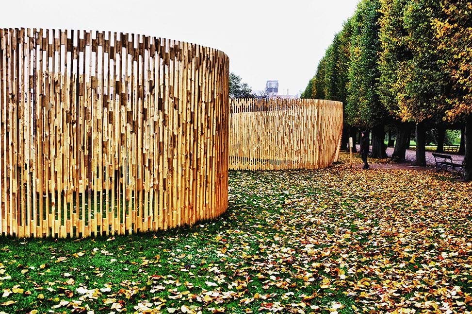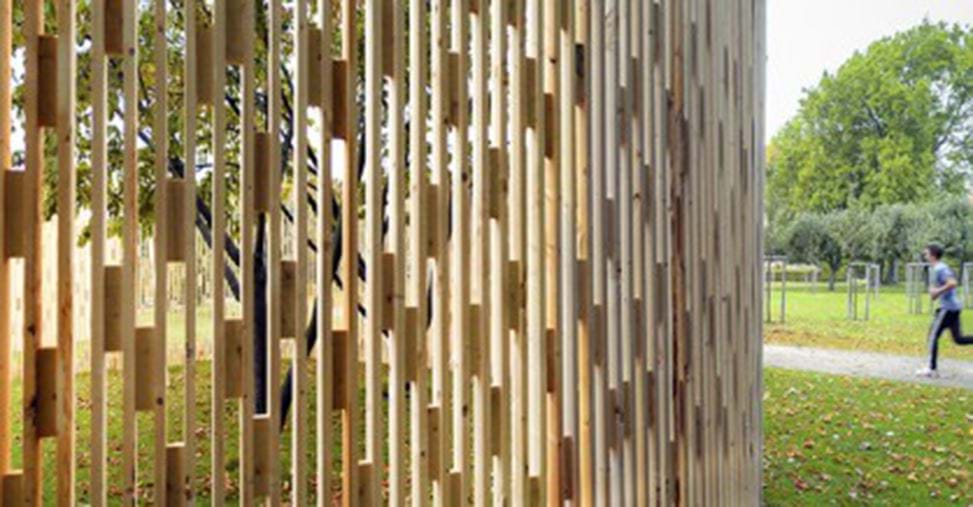 Inspirationsbilleder af en let konstruktion, som danner en afskærning. Afskærmning er opsat i et bugtende system af trælameller, som tillader et diffust indblik og filtrering af sollys (Fabric).