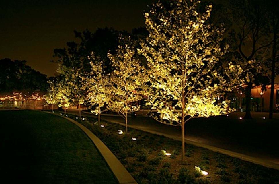 Effektbelysning på en trærække. Belysningen skaber en særlig stemning.