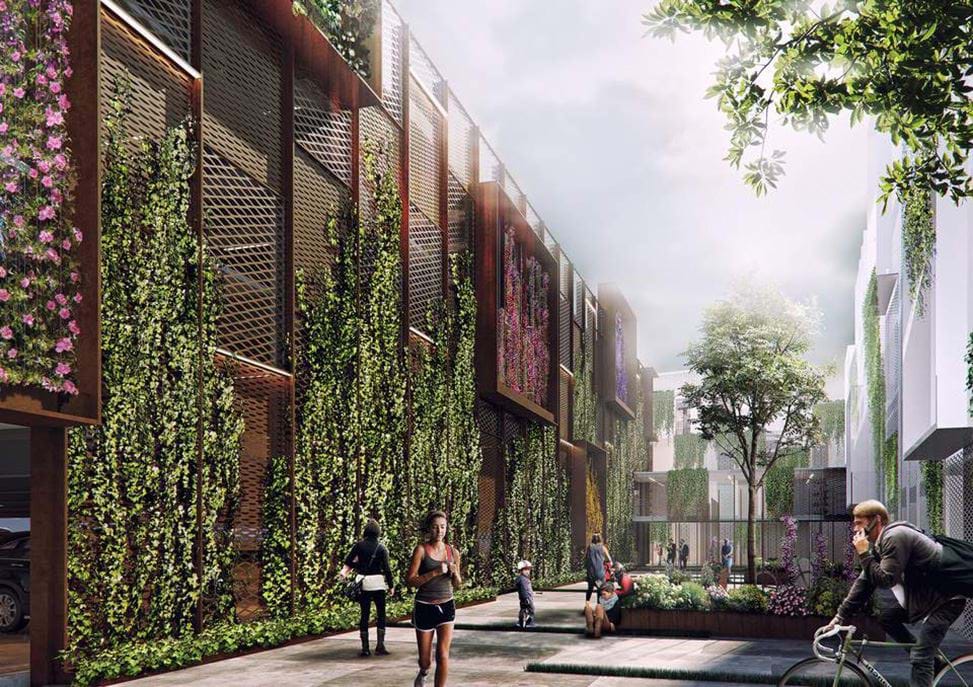 Facadebillede på et eksempel hvorledes facader på parkering i konstruktion kan udformes. Facaderne fremstår med en "lethed", som i høj grad begrønnes.