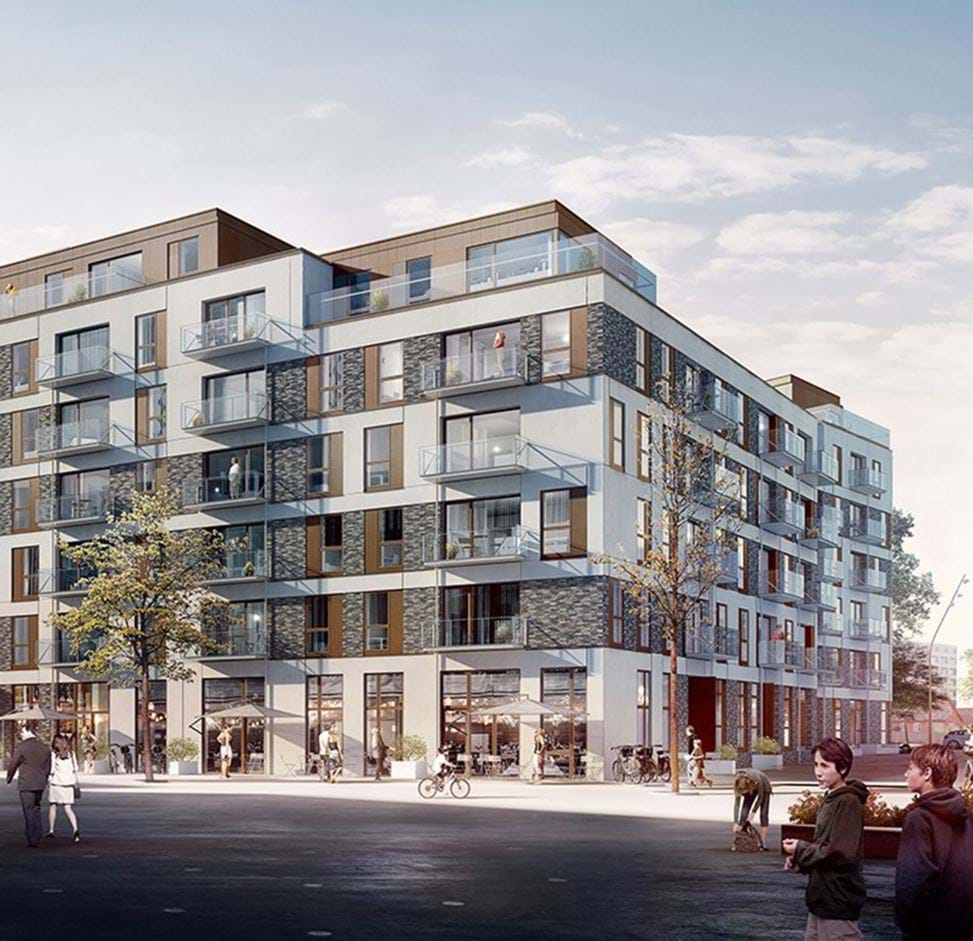 Inspirationsbillede af facader med materiale- og farvevalg, detaljering mv., som fremtræder med et sammenhængende arkitektonisk formsprog (Arkitema).