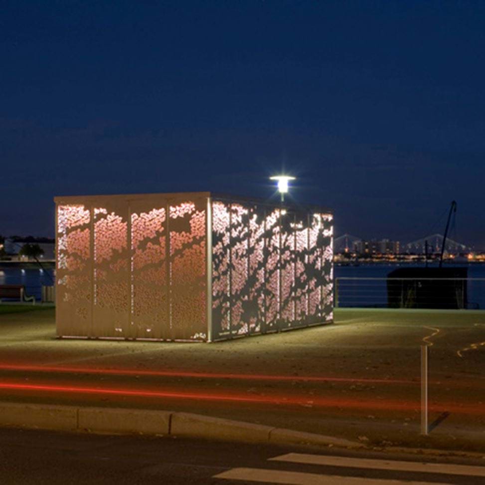 Inspirationsbillede til facader på kundevognsbygning. Bygningerne står som lysende elementer (effektbelysning) i et byrum.