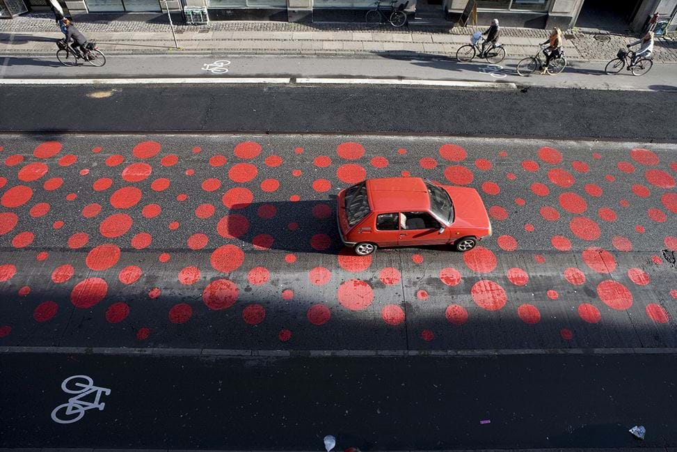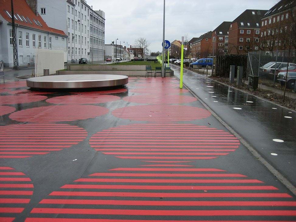På billedet er der anvendt termoplast, som tegner mønster på belægning og der skabes nye spændende og rå byrum.