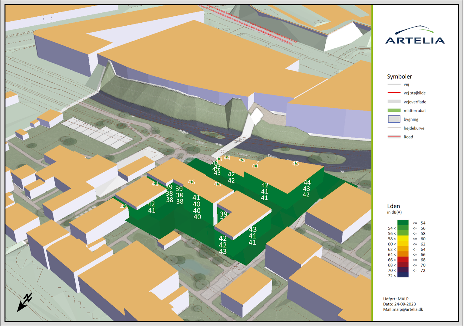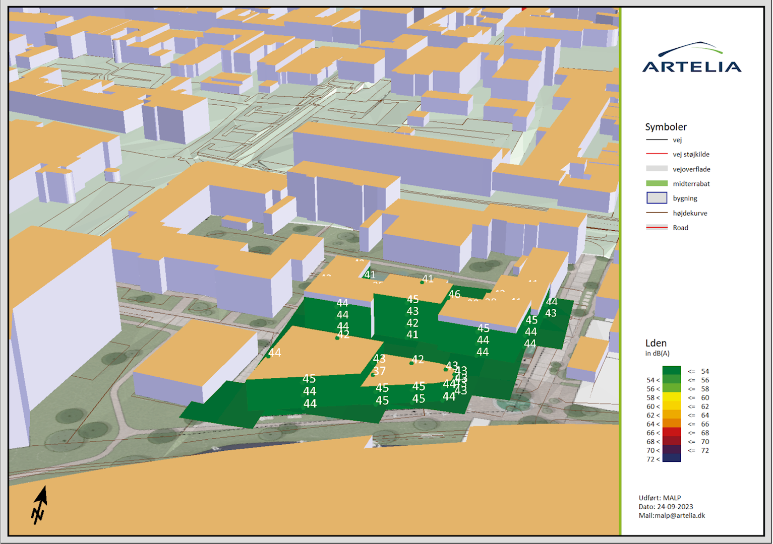 Støjkort der viser at facader og opholdsarealer er fri for støj, når Niels Gyldings Gade er lukket.