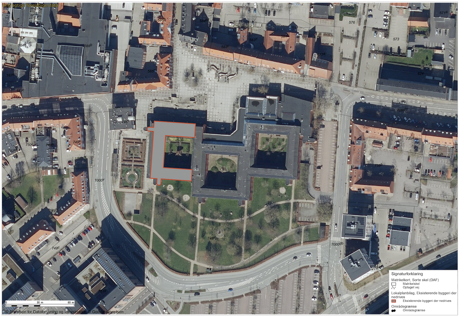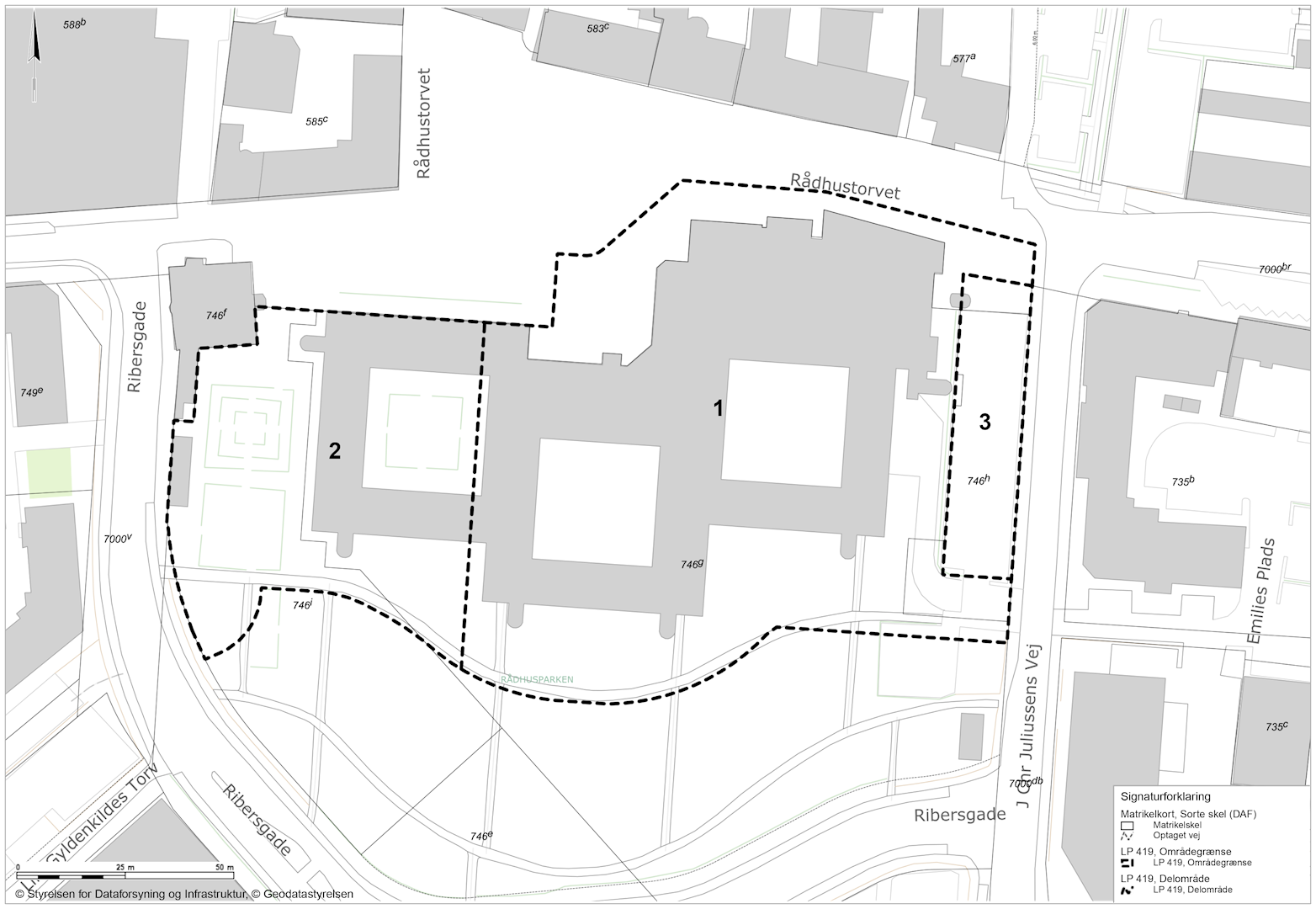 En del af det tidligere rådhus tillades nedrevet inden for delområdet. Området må ikke bebygges, men kan anvendes til vandhåndtering, rekreative formål, som park og lignende med maksimalt op til 72 parkeringspladser. Parkeringsarealet skal fremstå i grus og med træer, og er placeret hvor der fremtidigt er reserveret areal til et parkeringshus, jf. Udviklingsplanen for Åkvarteret.