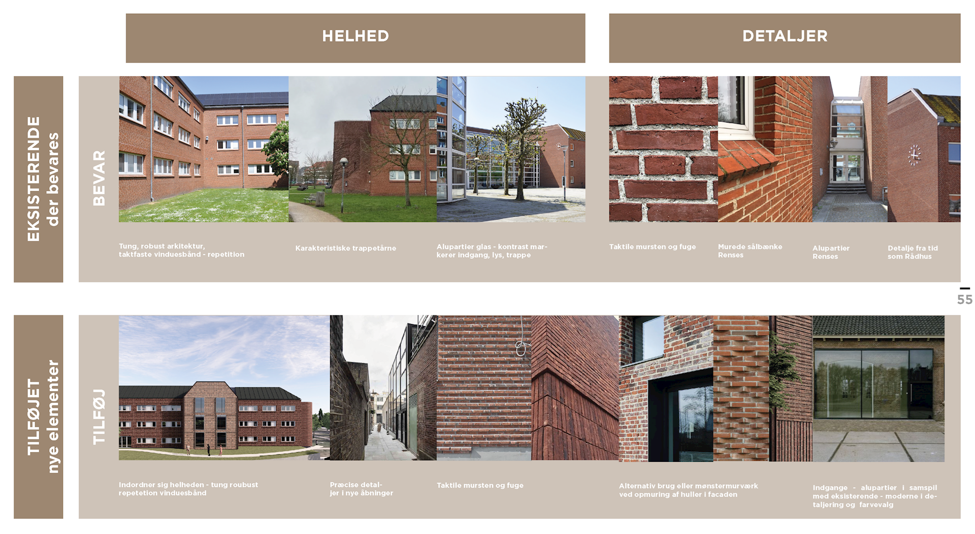 Det eksisterende byggeris facader består af røde tegl med lyse fuger, hvide vinduesåbninger og glaspartier, samt sorte tage med tagpap og solceller. De eksisterende kvaliteter i rådhuset i form af robuste materialer, røde mursten og de gennemgående vinduesbånd giver bygningen en sammenhæng og helhed.