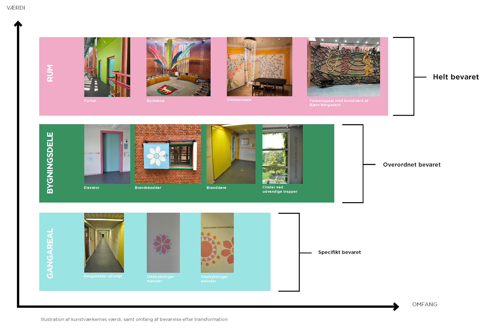 Bygningens eksisterende kvaliteter ses som en stor værdi for projektet, med et hovedgreb om at bevare og forstærke disse. Bygningens eksisterende værdi er blandt andet:
