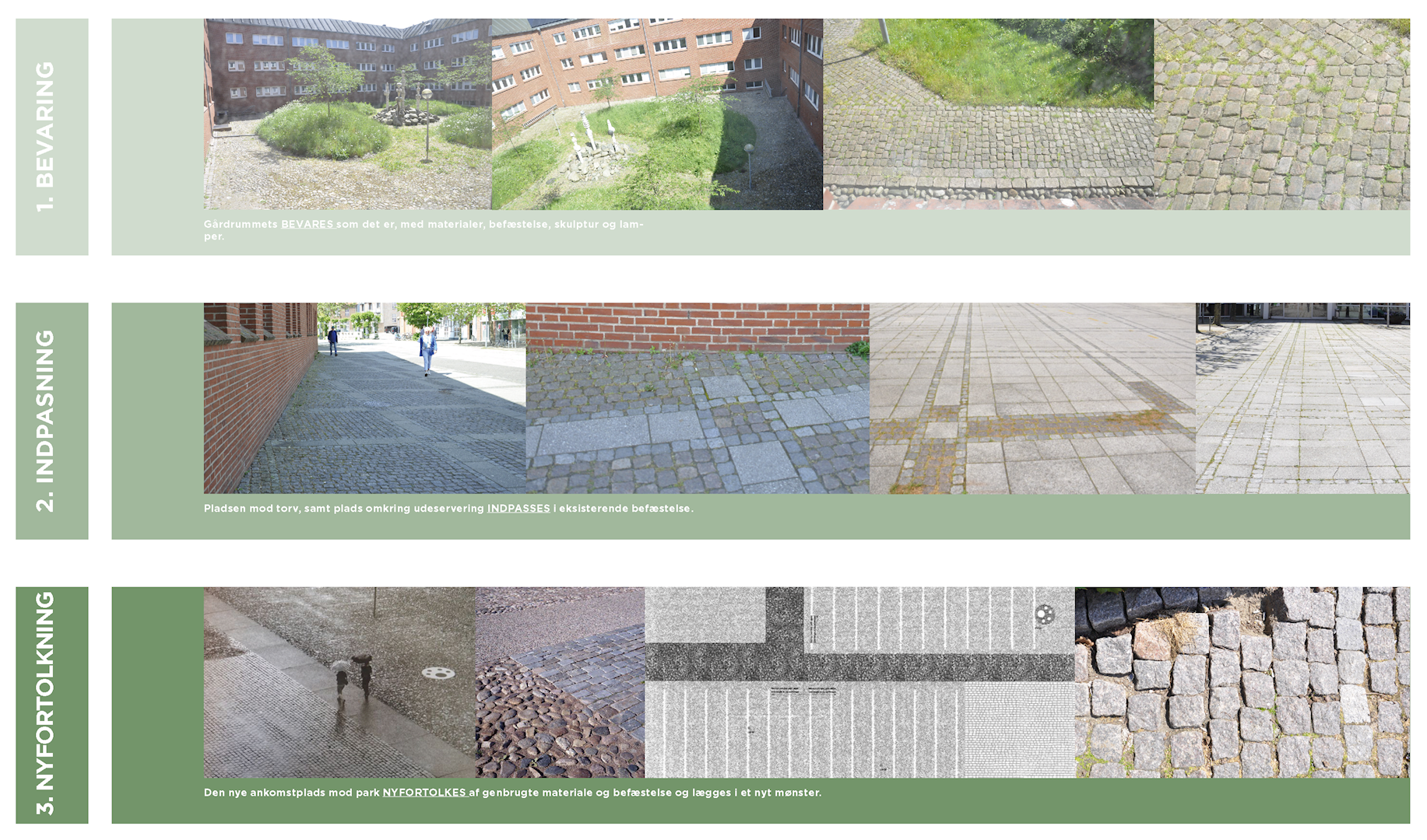 - Funktionsarealer for bygningen beliggende mod torvet bevares, og inventar og belægningsmaterialer genanvendes så vidt muligt.