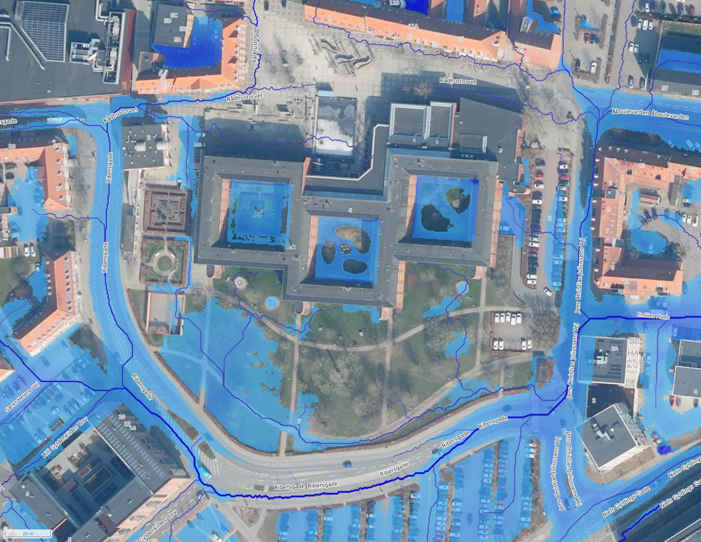 Eksisterende strømningsveje på terræn og risikospots for oversvømmelse ved ekstremregn på Rådhustorvet i dag. Samme volumen af ekstremregn skal kunne tilbageholdes i området. Data stammer fra SCALGOLive. Der er anvendt 51 mm nedbør svarende til en 100 års hændelse af 12 timers varighed fratrukket hverdagsregnsmængden.