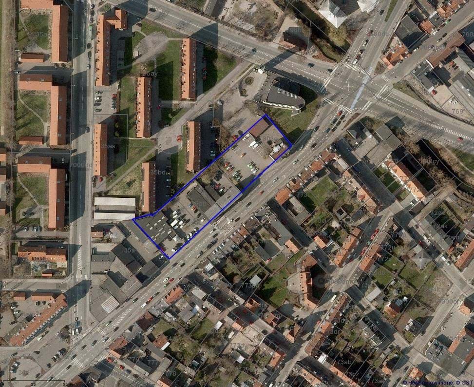 Luftfoto med blå markering af området.