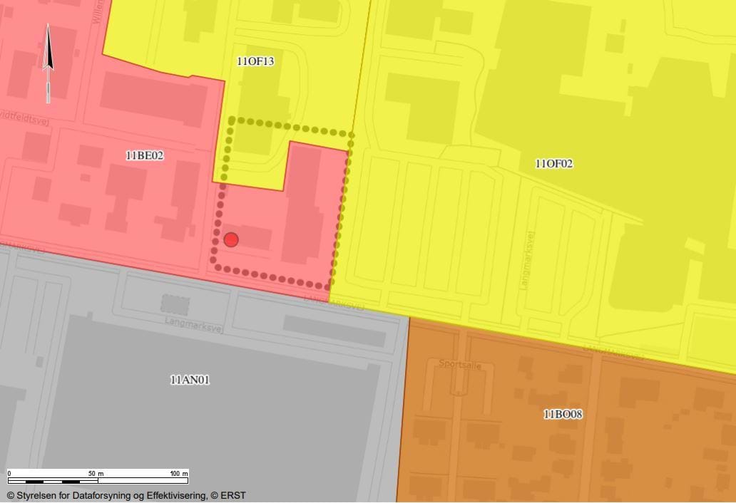 Kort over eksisterende vedtagende kommuneplanrammer. Kommuneplantillægget 2021-04 ændre inden for lokalplanafgrænsning, rammerne til et samlet Centerformål.