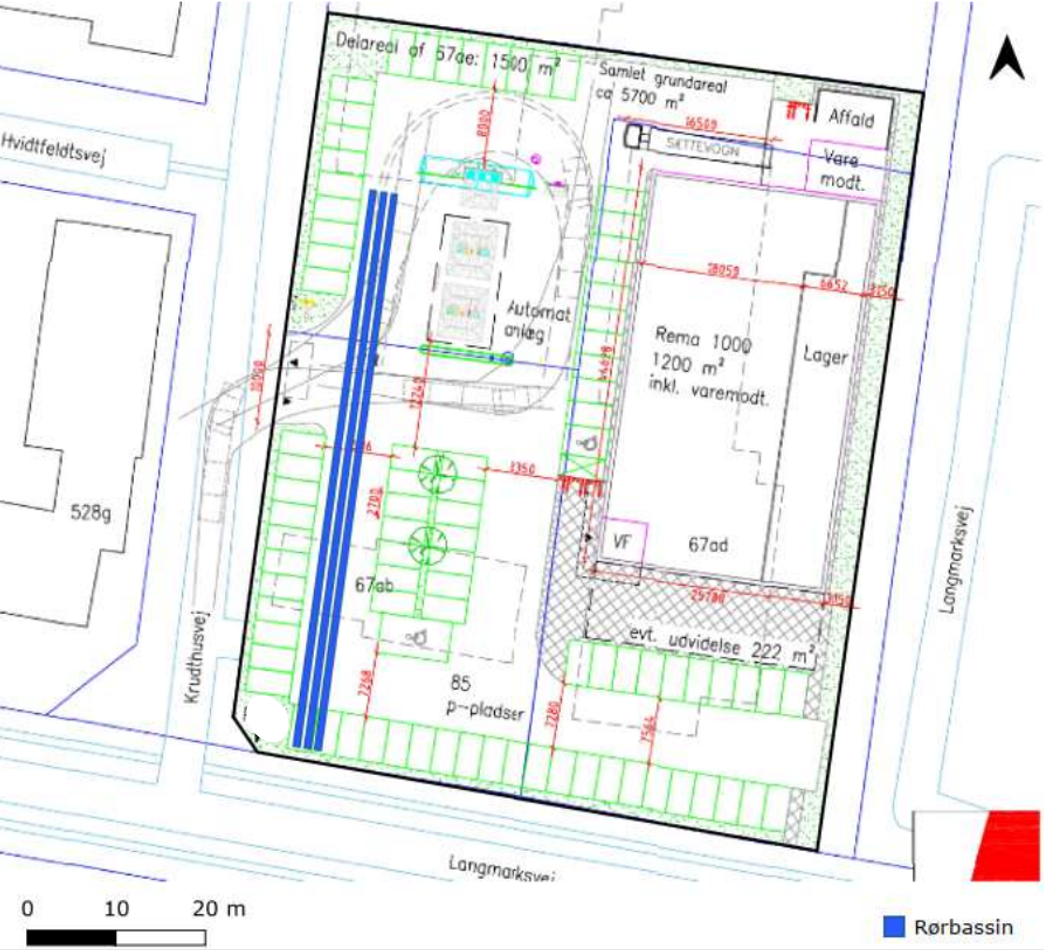 Der anlægges et rørbassin under parkeringspladsen, og der kan suppleres med en sænkning af parkeringspladsen, så den kan rumme vandet til det senere kan sendes videre til recipient.