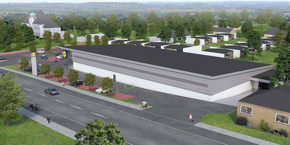 Bebyggelsen planlægges placeret langs det sydlige og vestlige skel med et fælles areal til adgang, parkering og varelevering nord og øst for bebyggelsen.