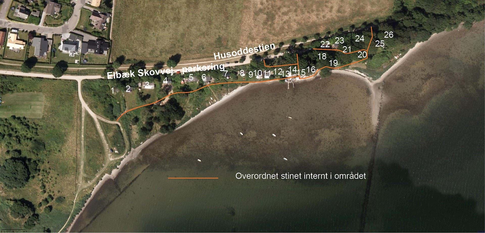 Kort, der viser det overordnede stinet i området. Adgangen langs vandet er en forudsætning, og er ikke vist, da der ikke er en sti