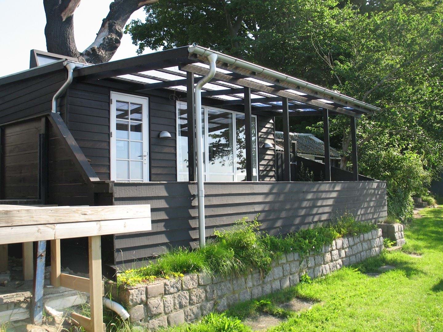 Eksempel på manglende samordning mellem to nabobygninger, hvor terrassen til venstre er unødig højt placeret i forhold til huset til højre.